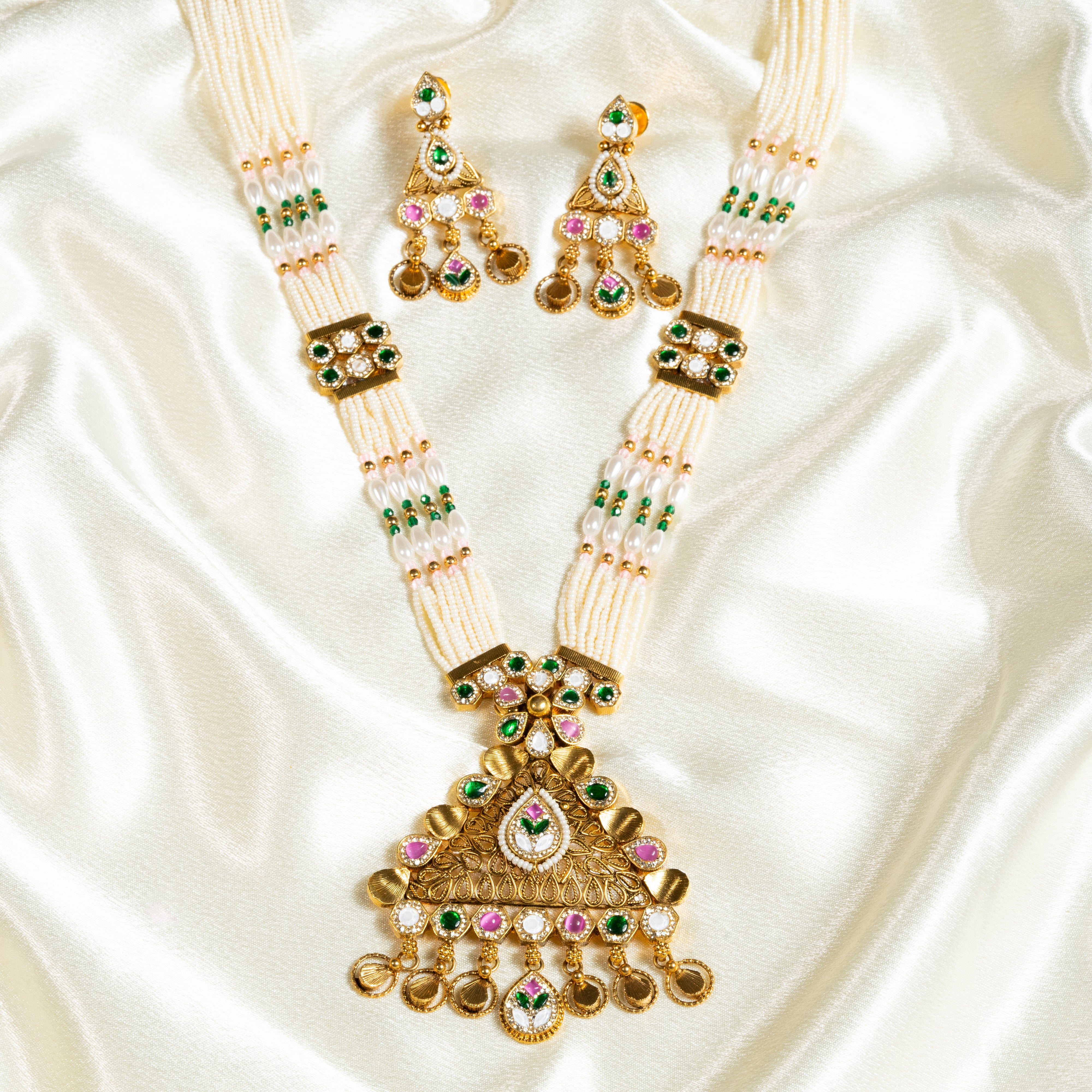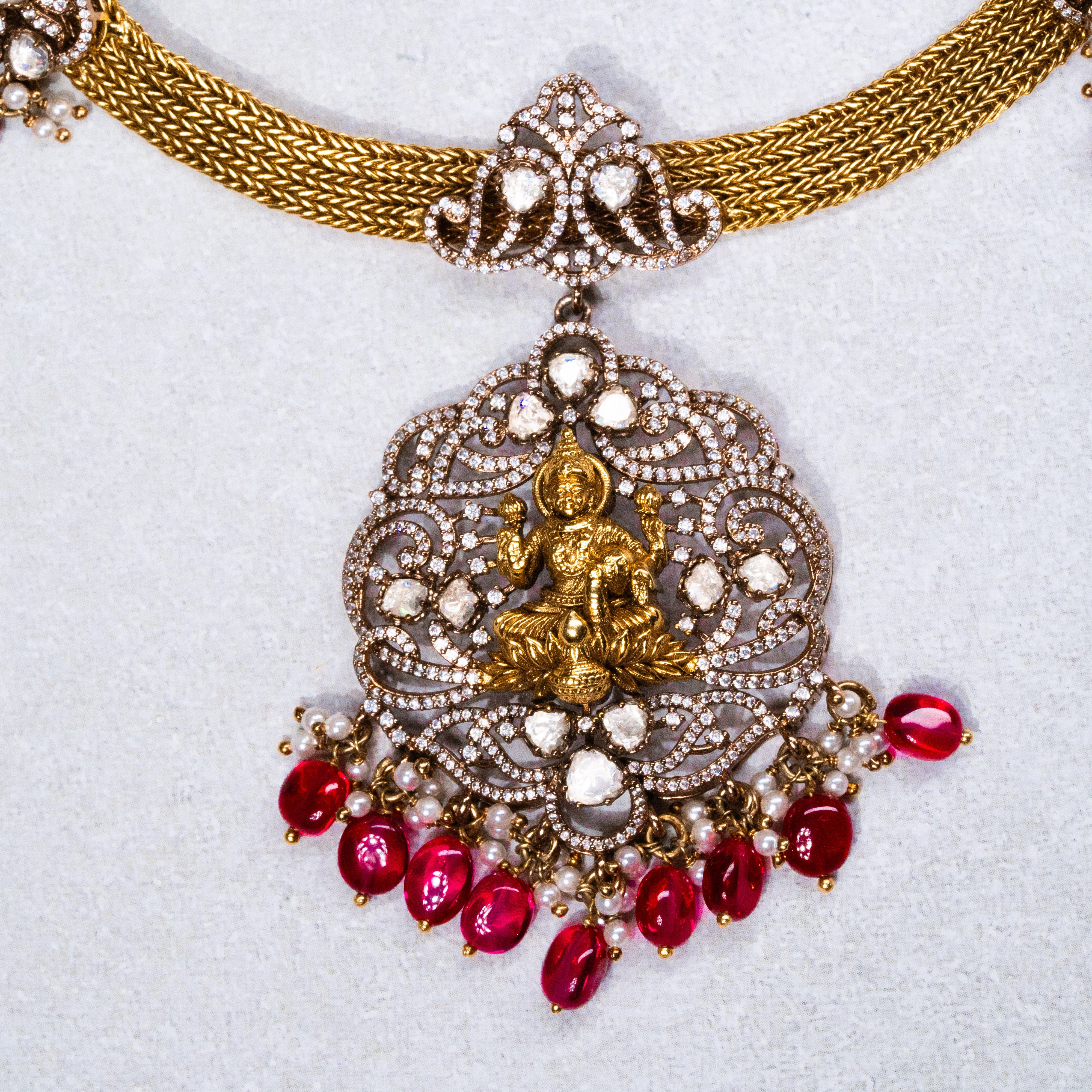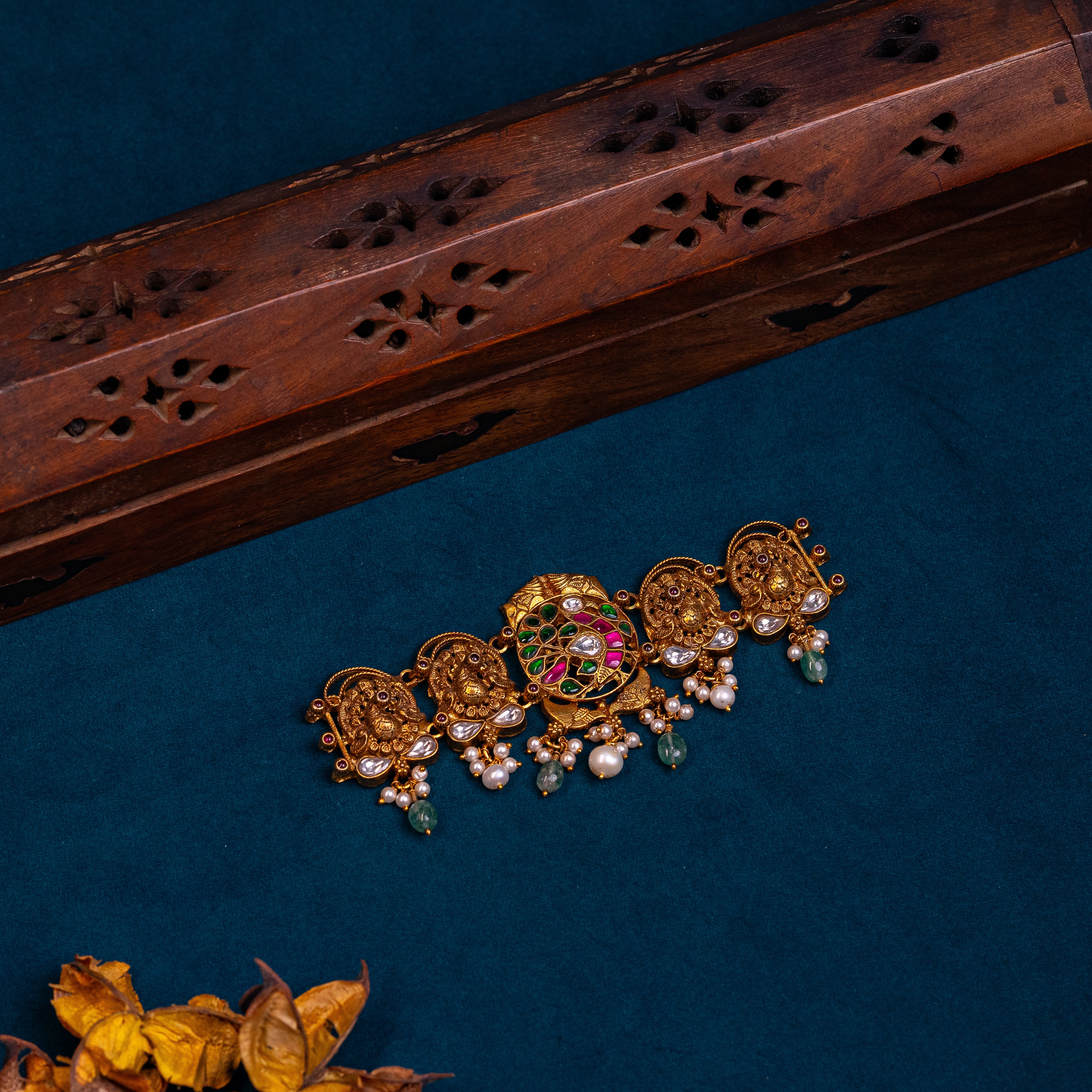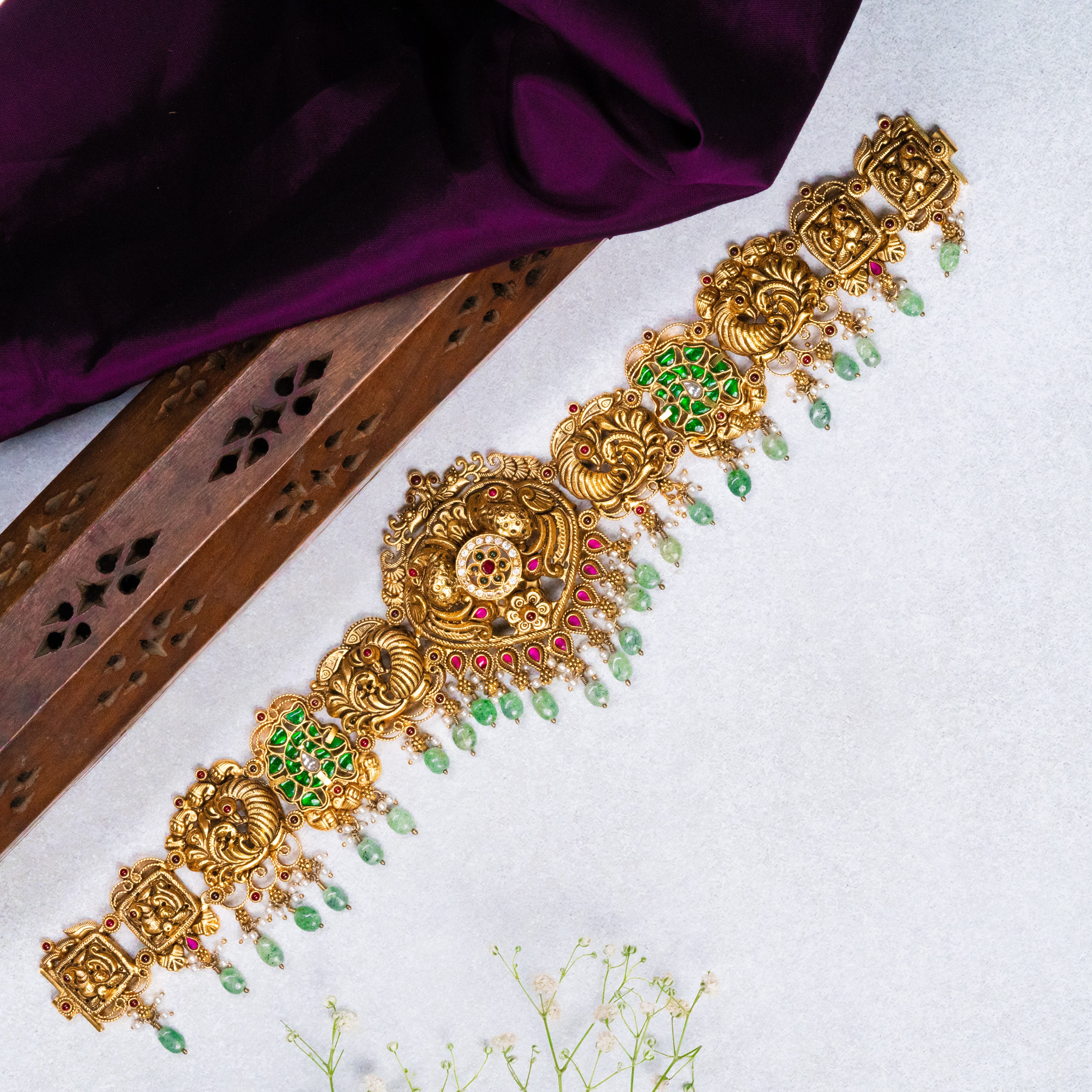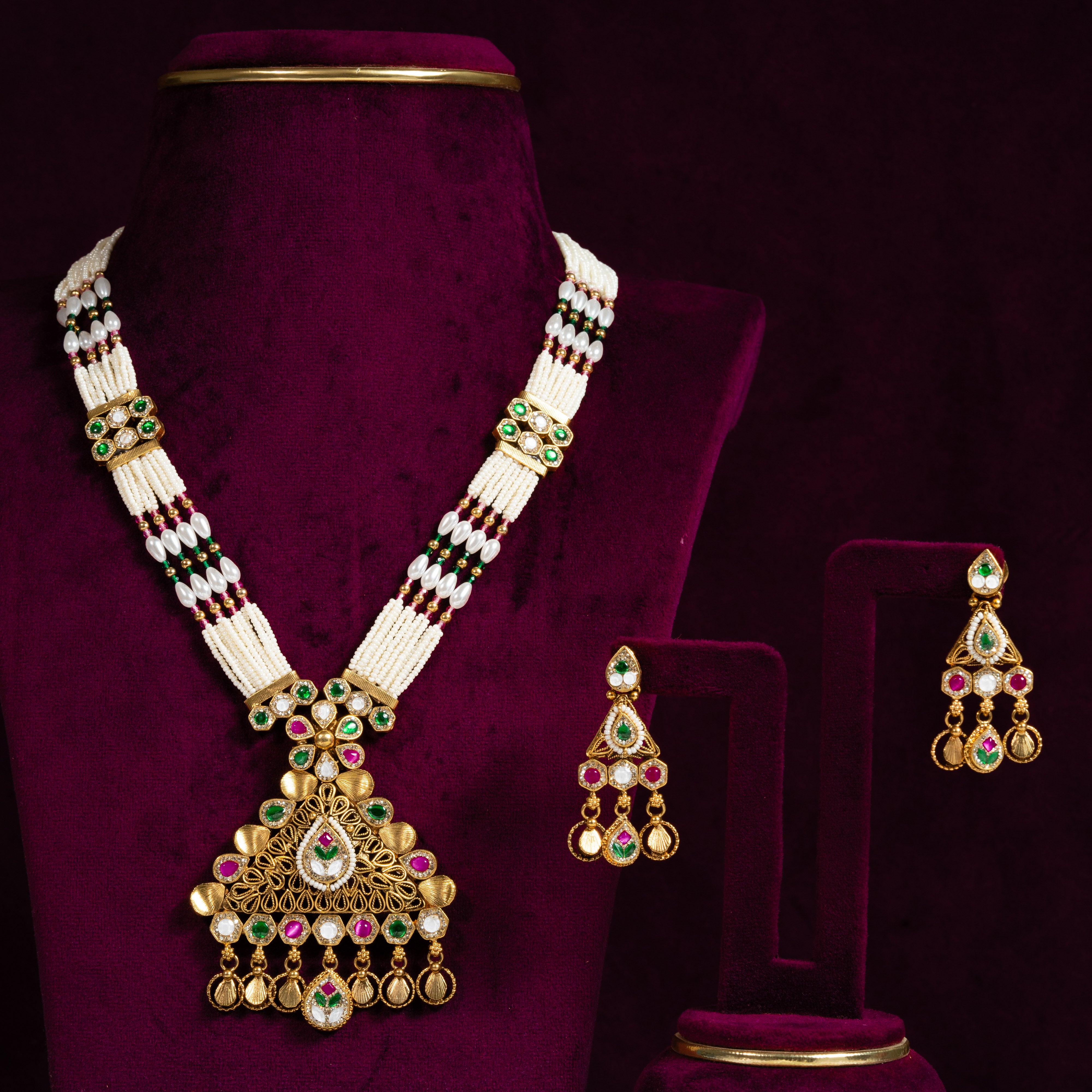 This stunning collection features intricate deep Nakas designs combined with exquisite Kundan work. Each piece is a unique creation, taking over 60-90 days to perfect, embodying the highest level of craftsmanship.