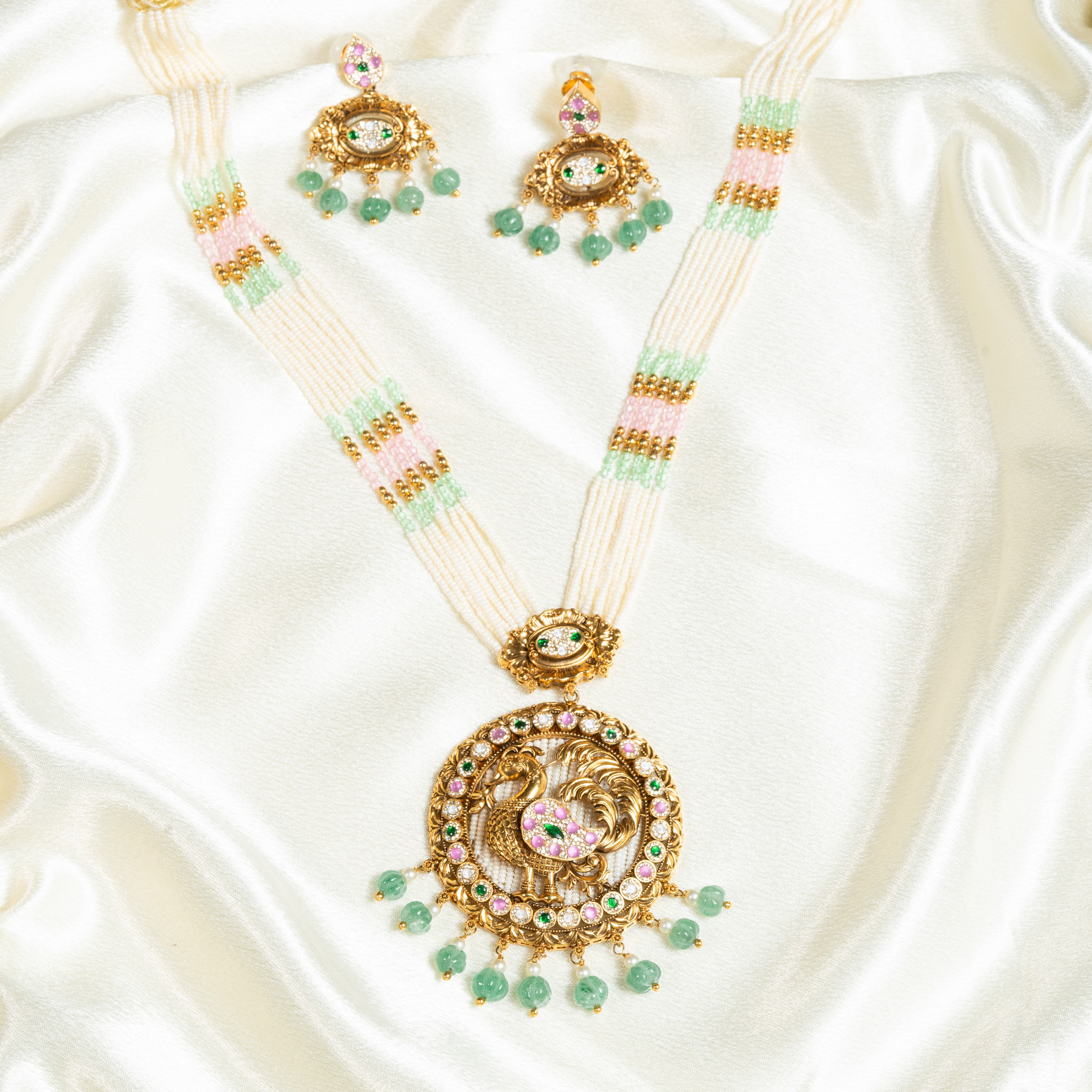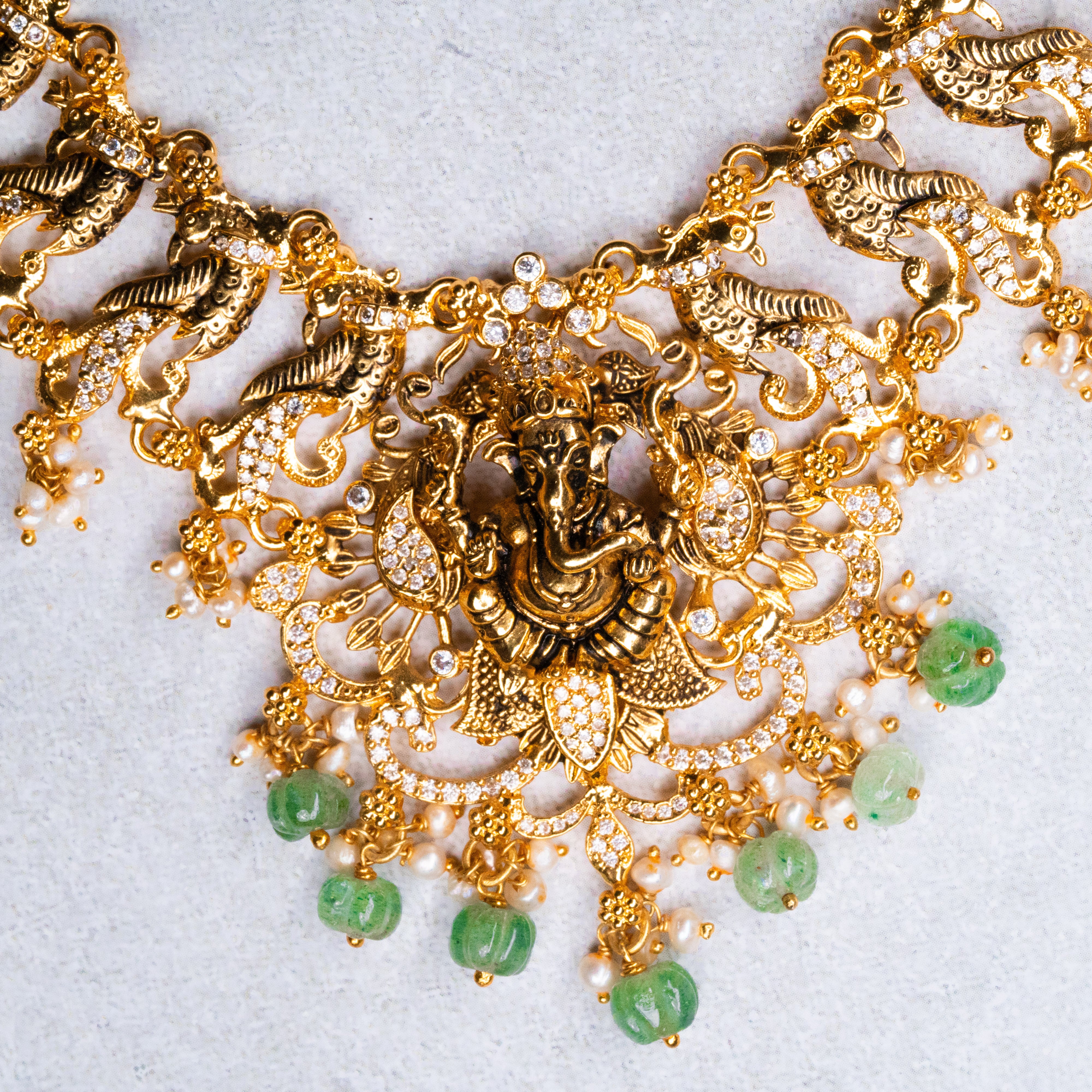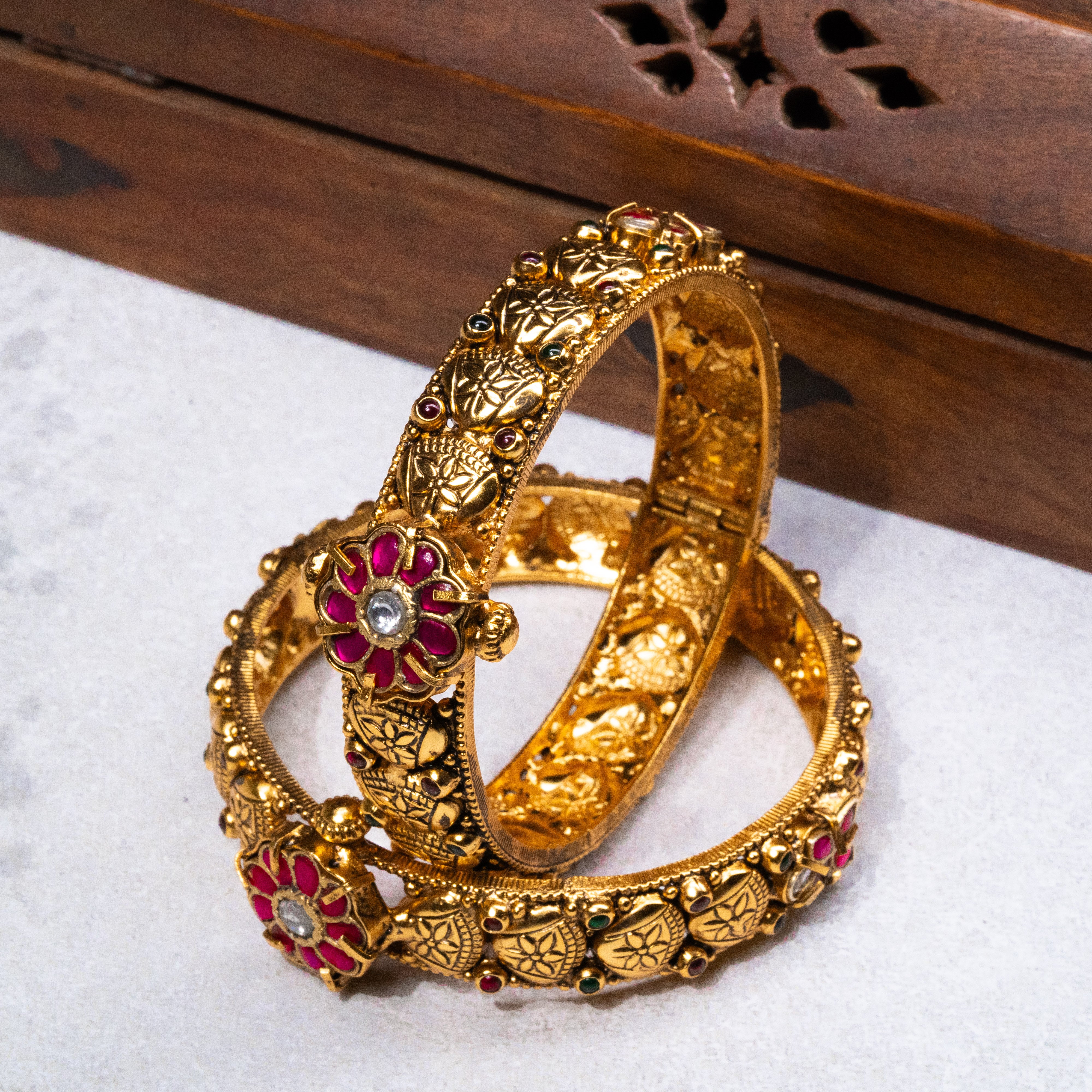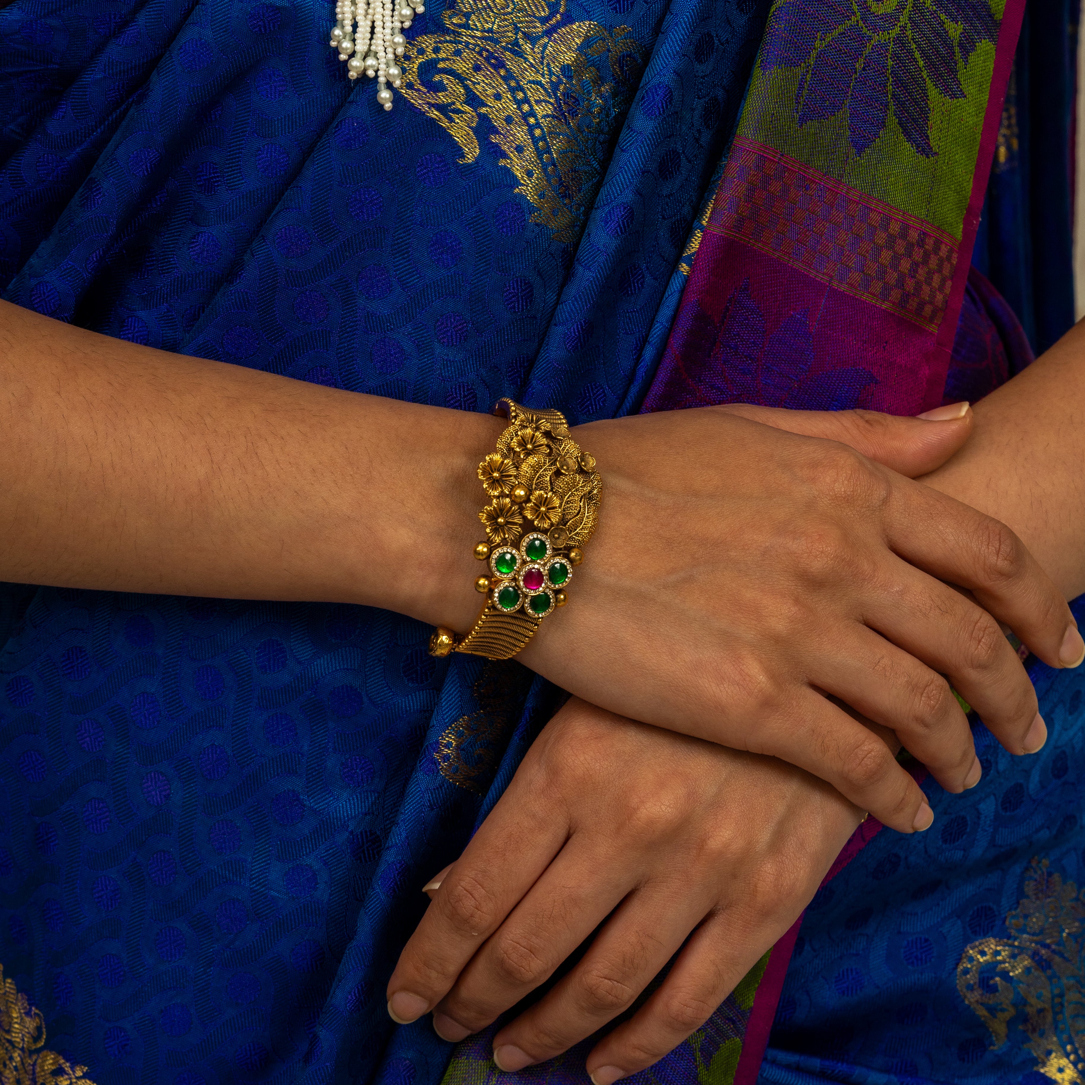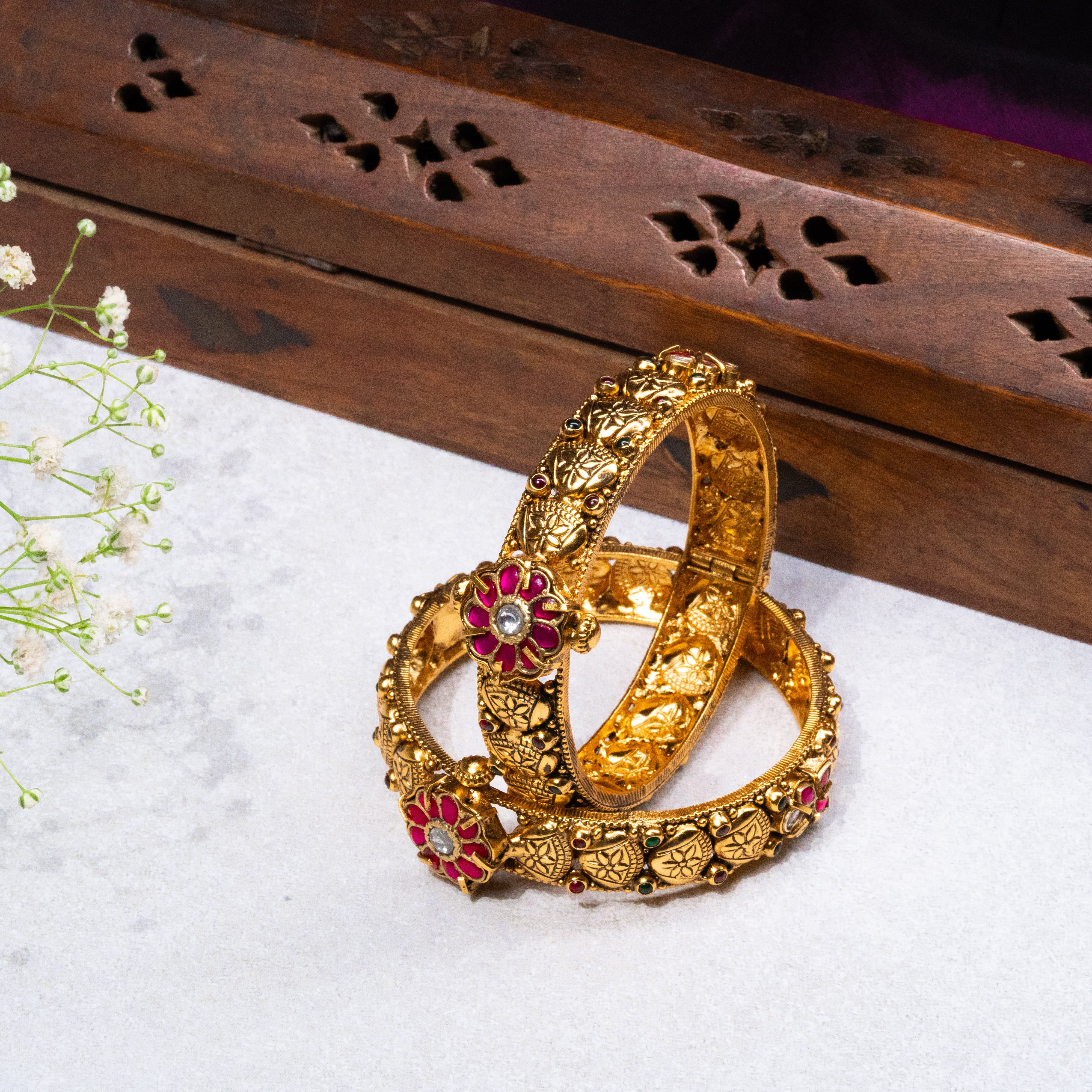 This stunning collection features intricate deep Nakas designs combined with exquisite Kundan work. Each piece is a unique creation, taking over 60-90 days to perfect, embodying the highest level of craftsmanship.