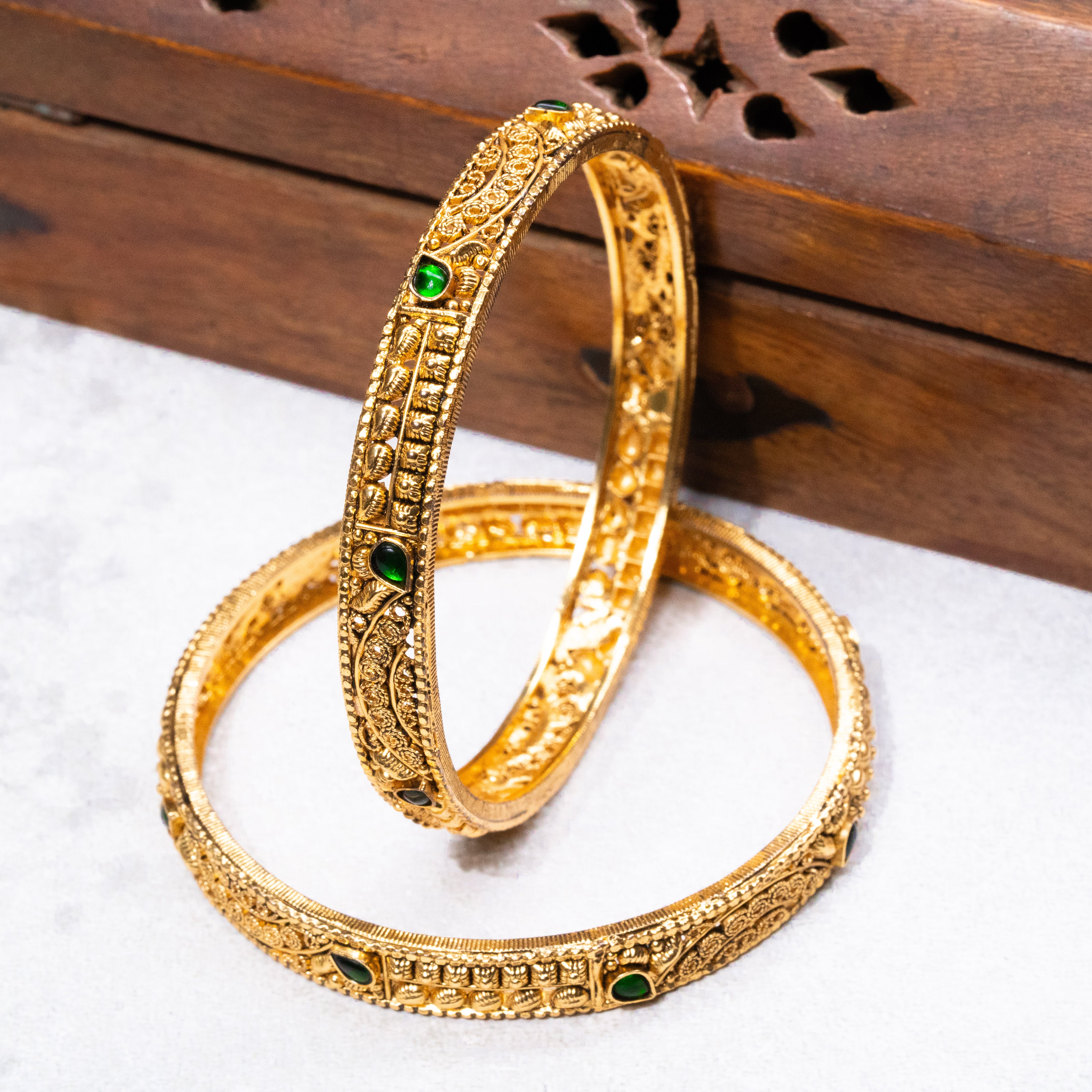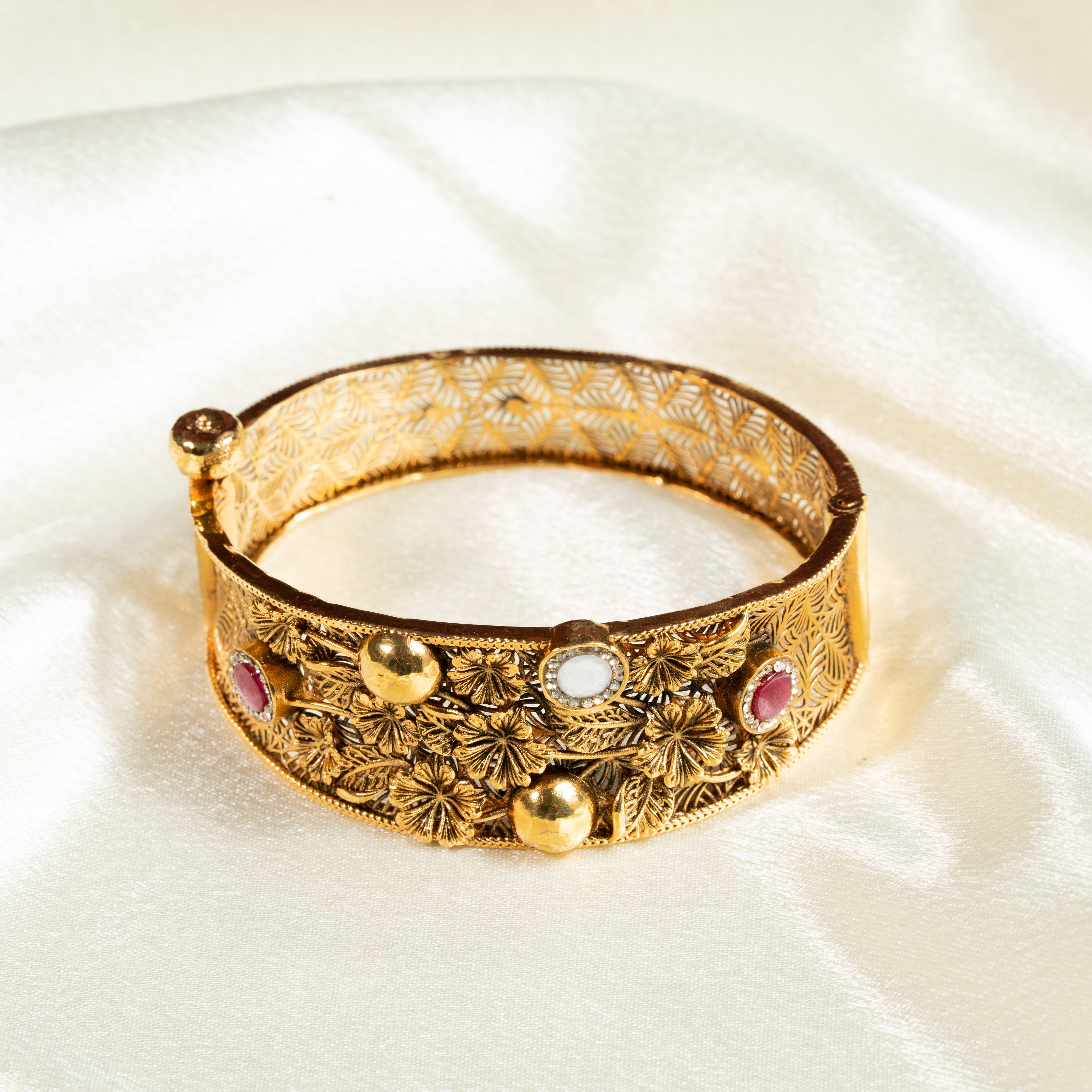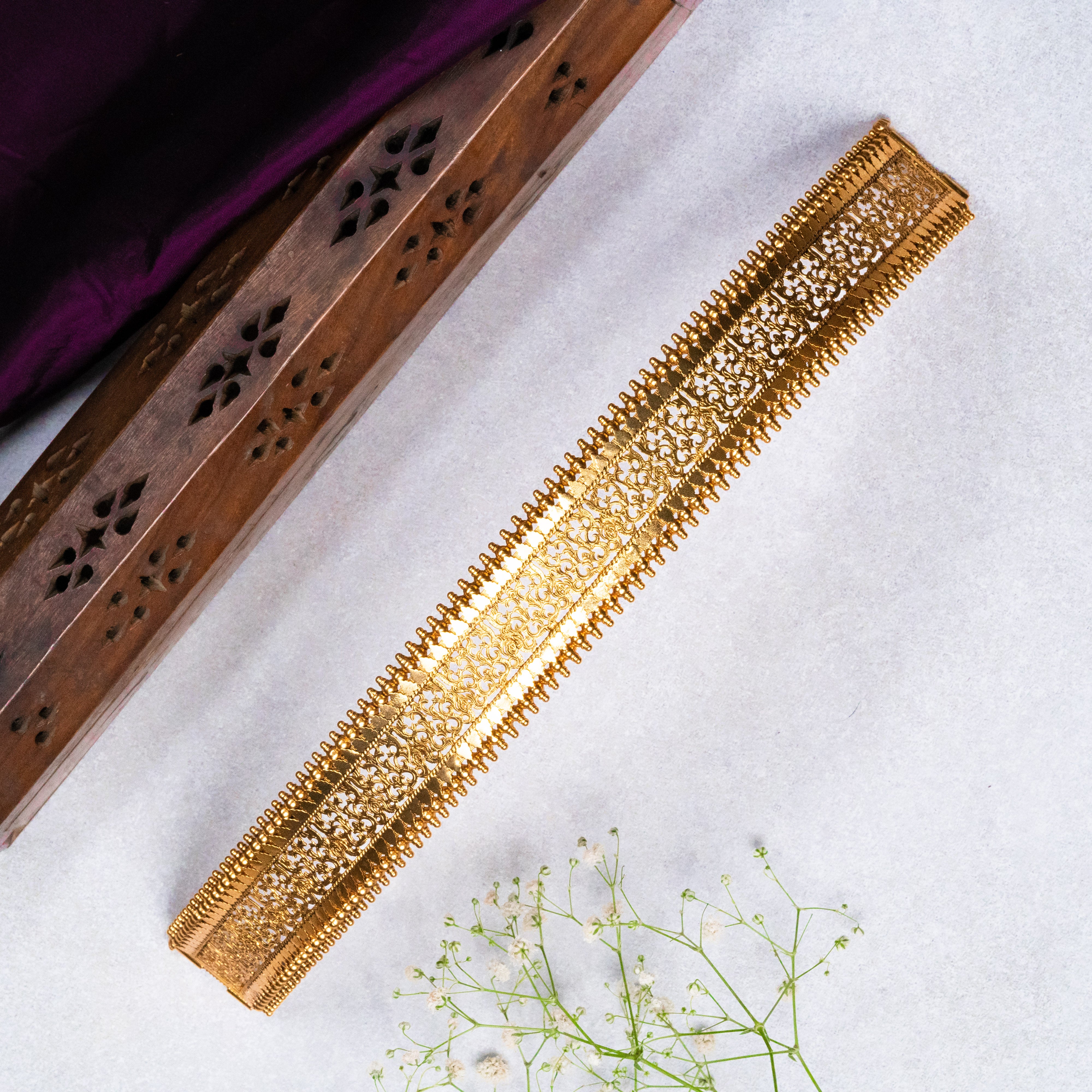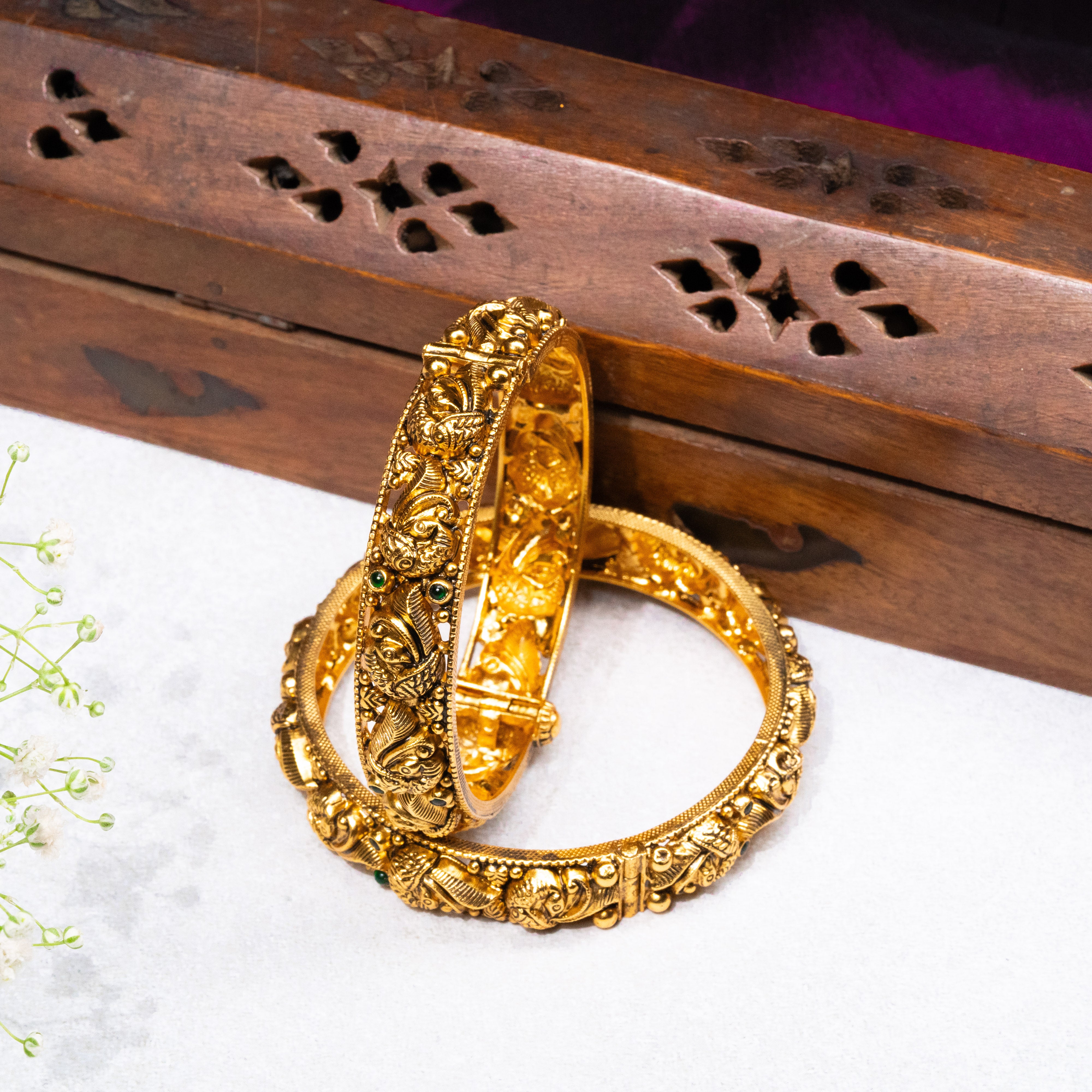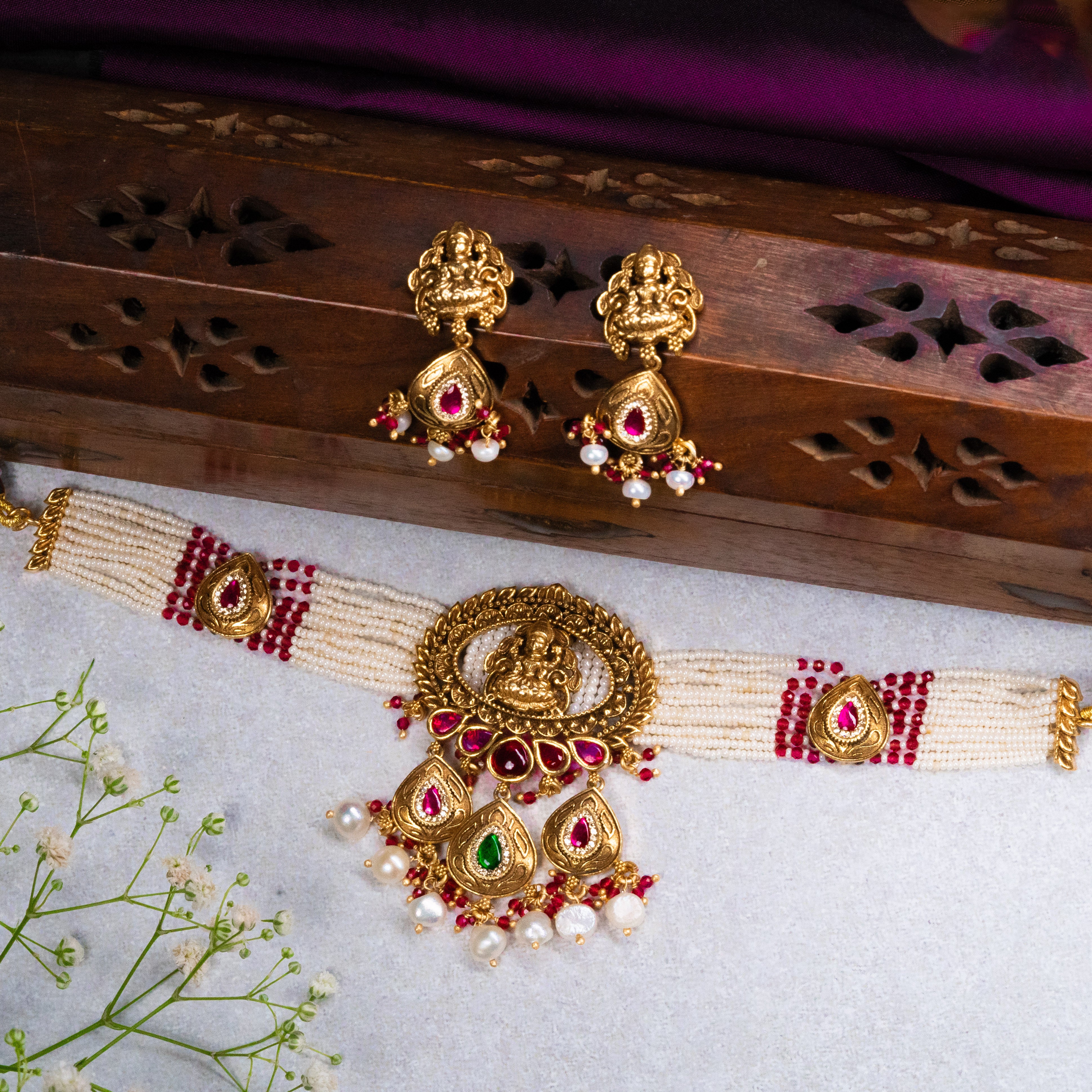 This stunning collection features intricate deep Nakas designs combined with exquisite Kundan work. Each piece is a unique creation, taking over 60-90 days to perfect, embodying the highest level of craftsmanship.