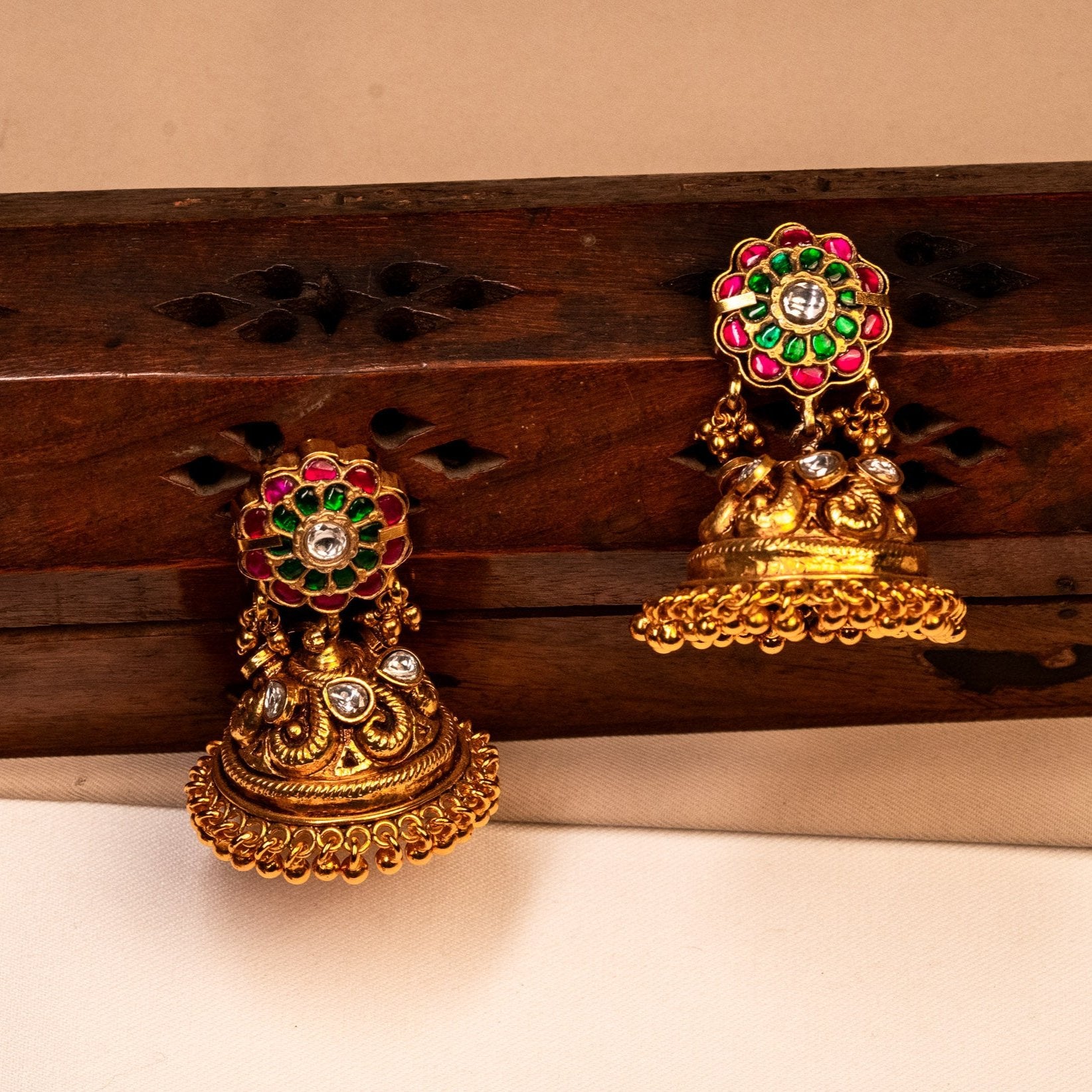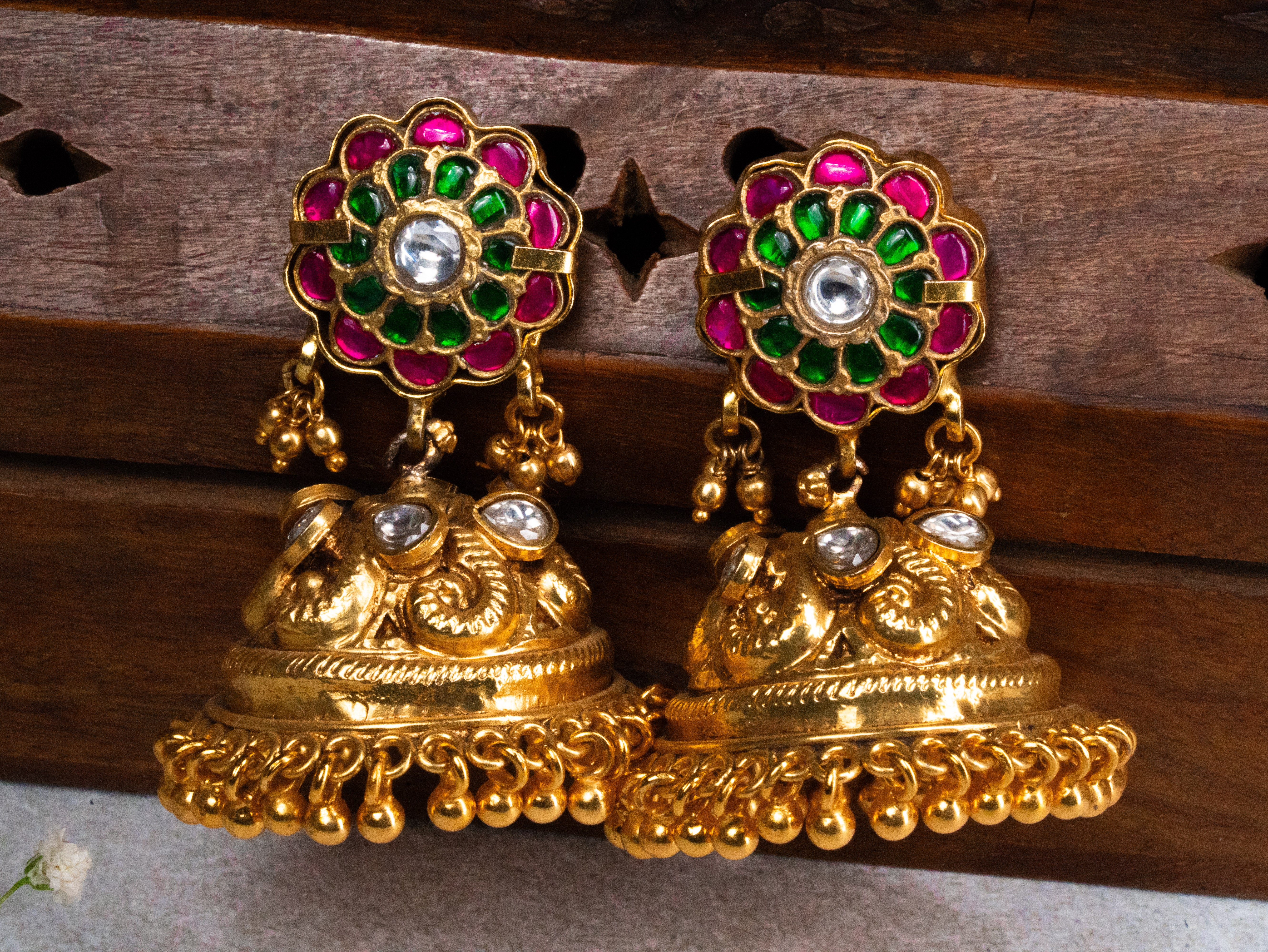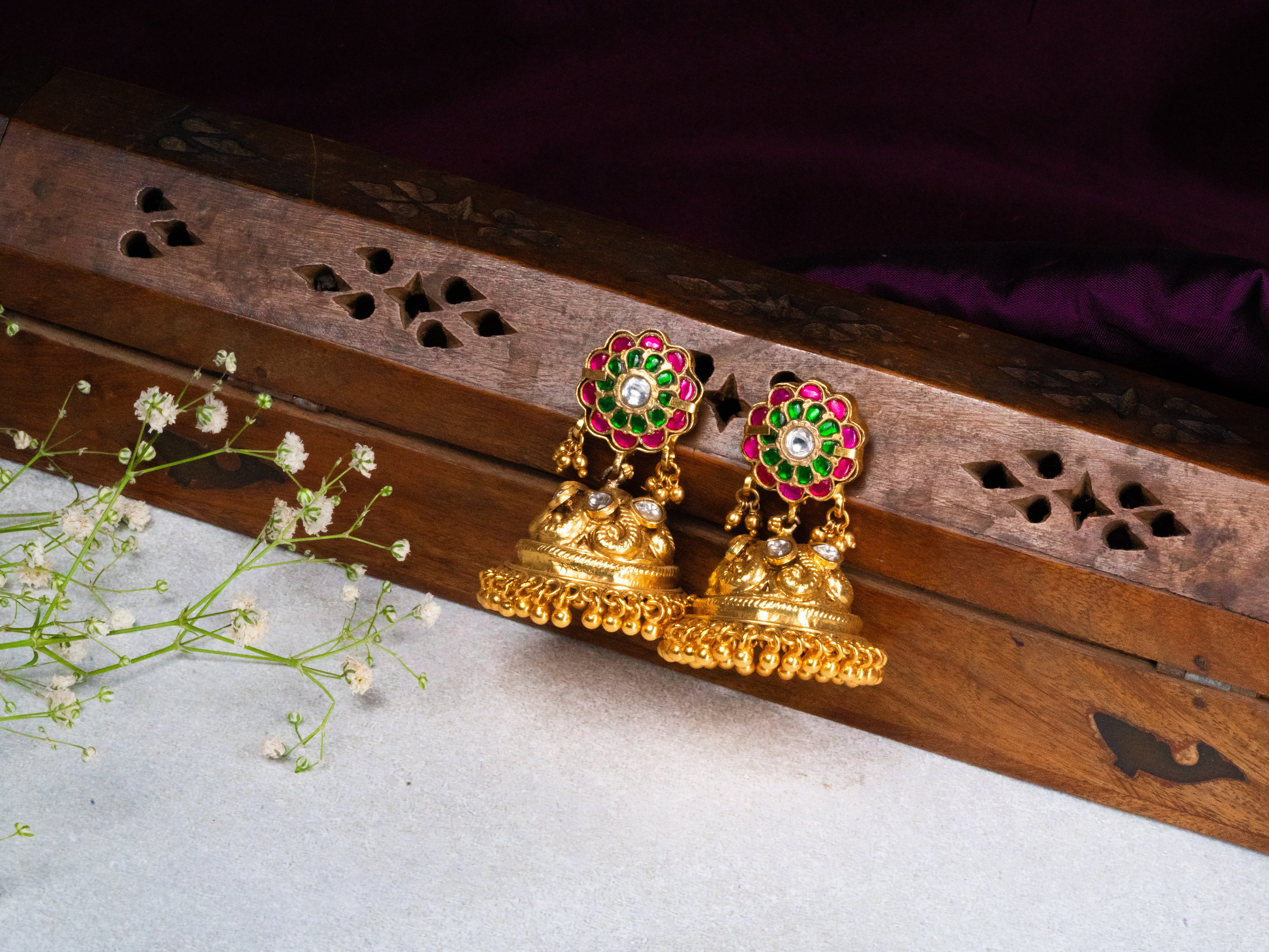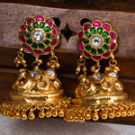 Deep Nakas Multi colour Kundan With Moissanite Jhumkas in 24kt Gold polish