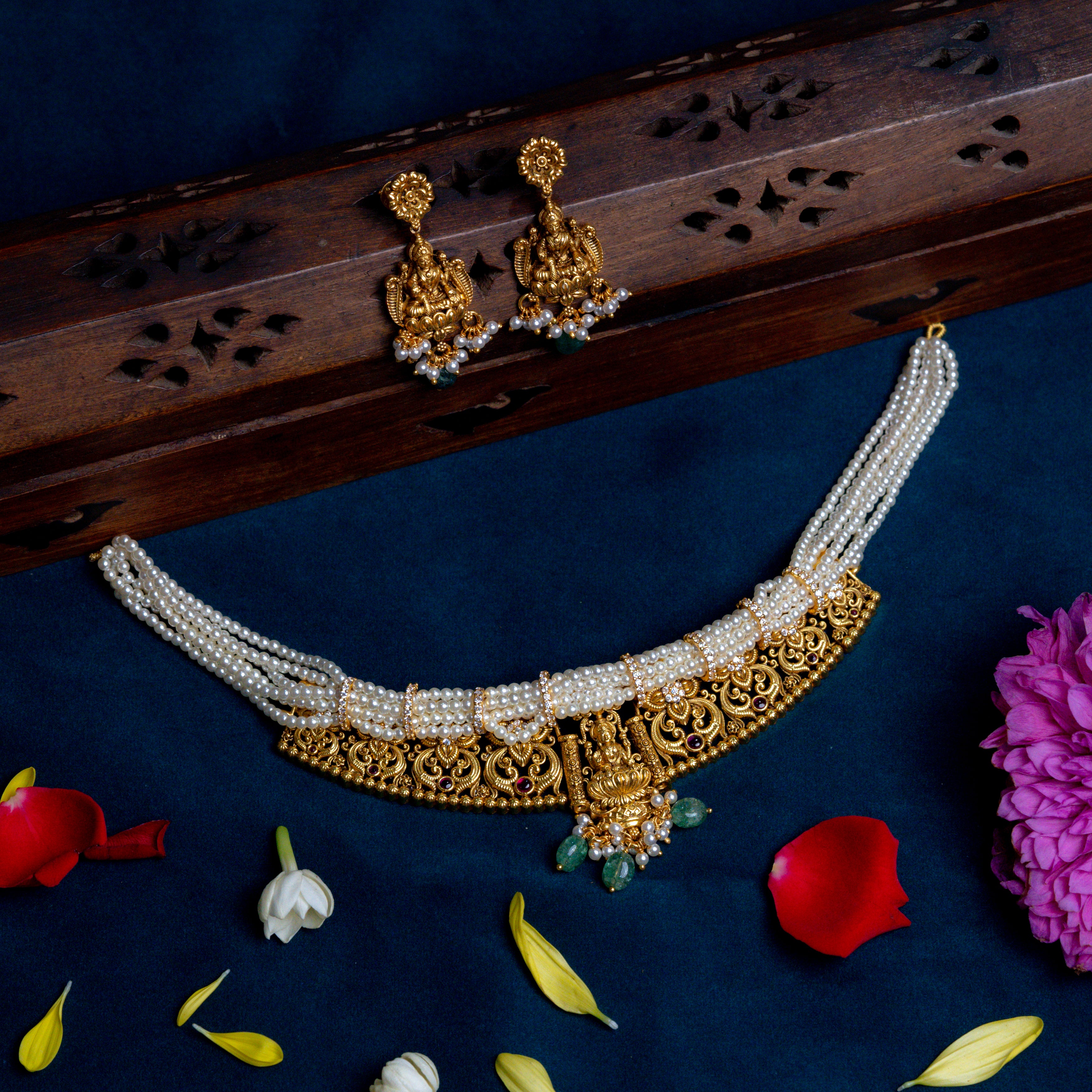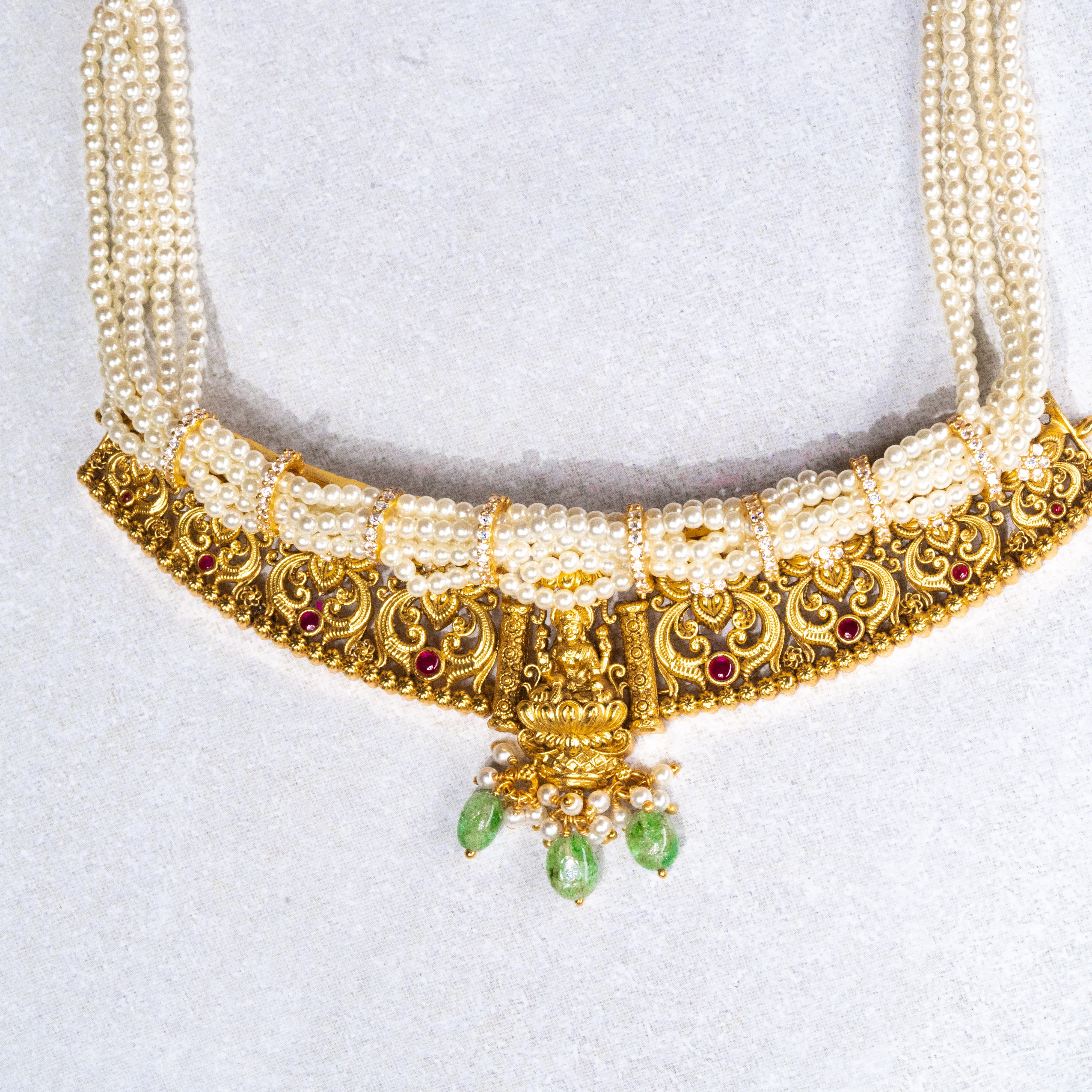 Deep Nakas Lakshmi studded With Green Polkis, CZ And Pearls Short Necklace in 24kt Gold Polish
