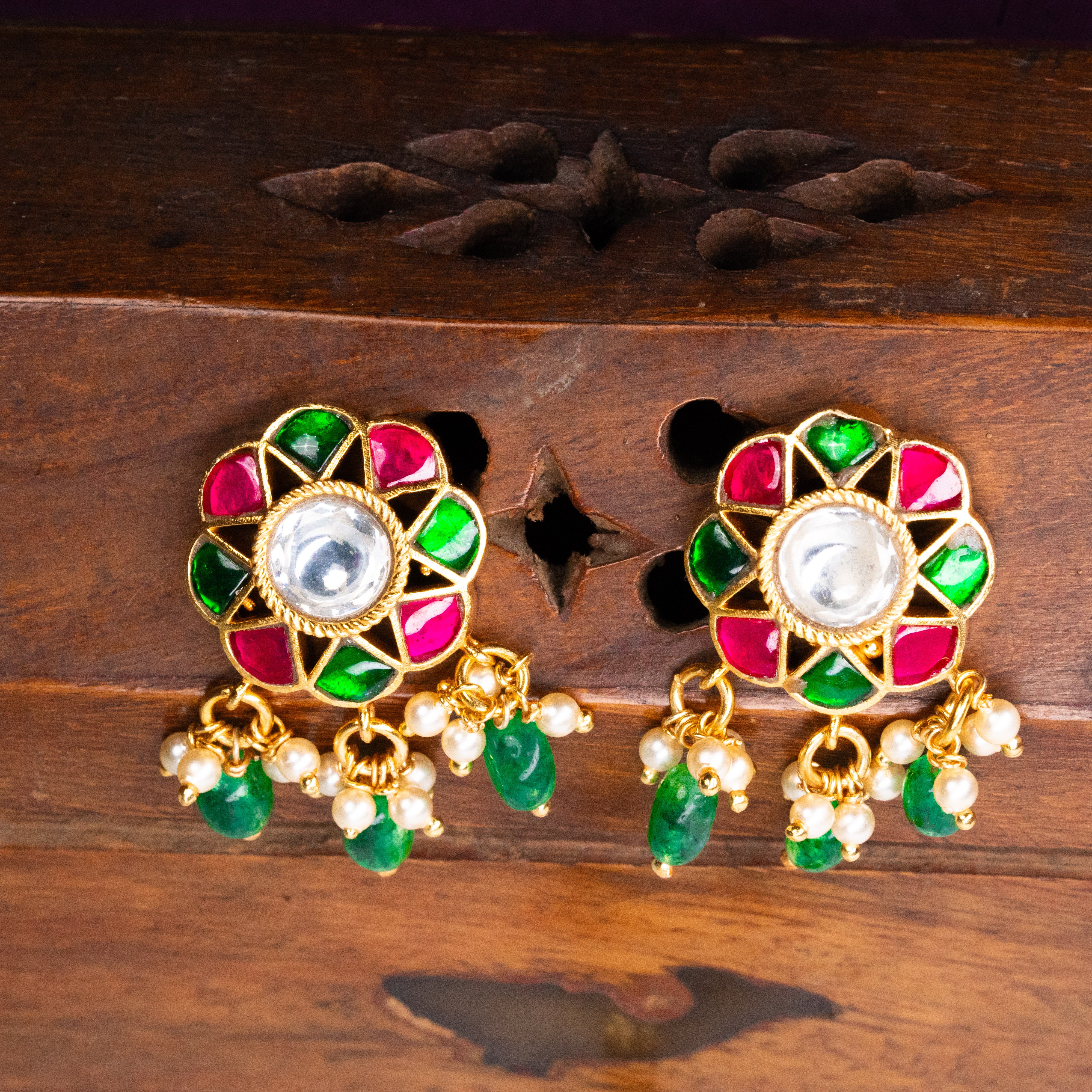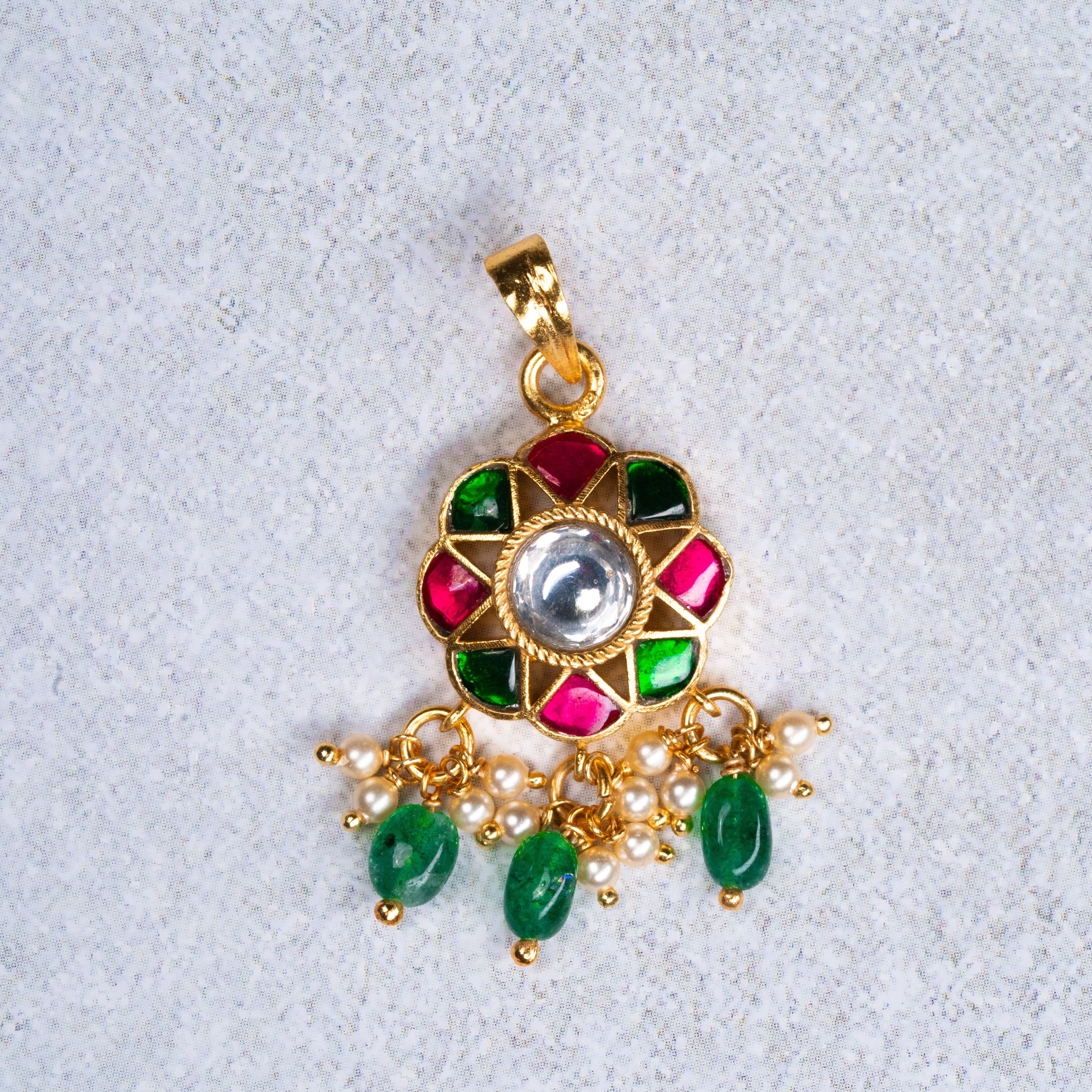 Pink And Green Kundan Studded Pendant With Earrings 24 kt Gold Polish