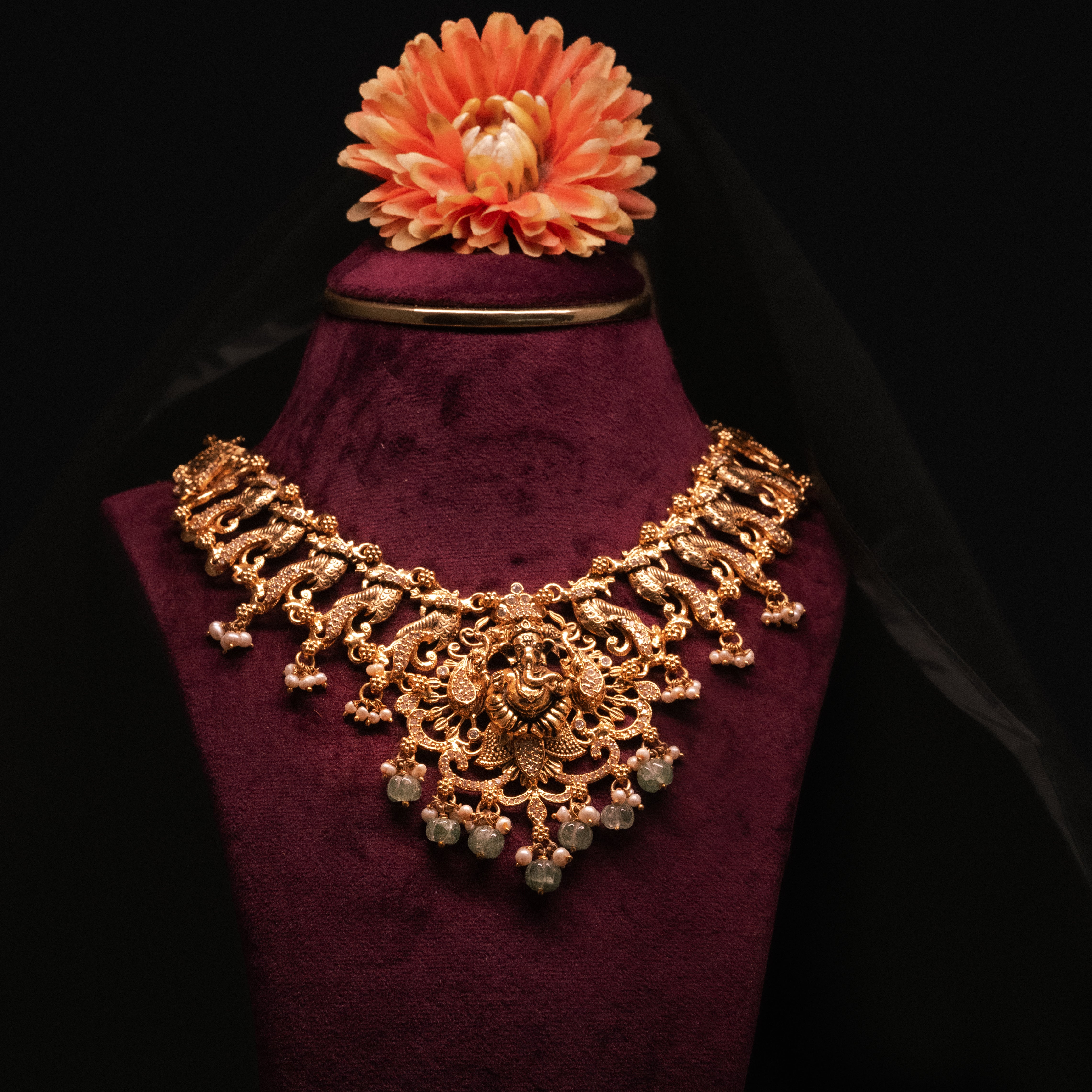 Deep Nakas Ganesha in Cz Studded Short Necklace 24kt Gold Polish
