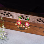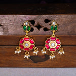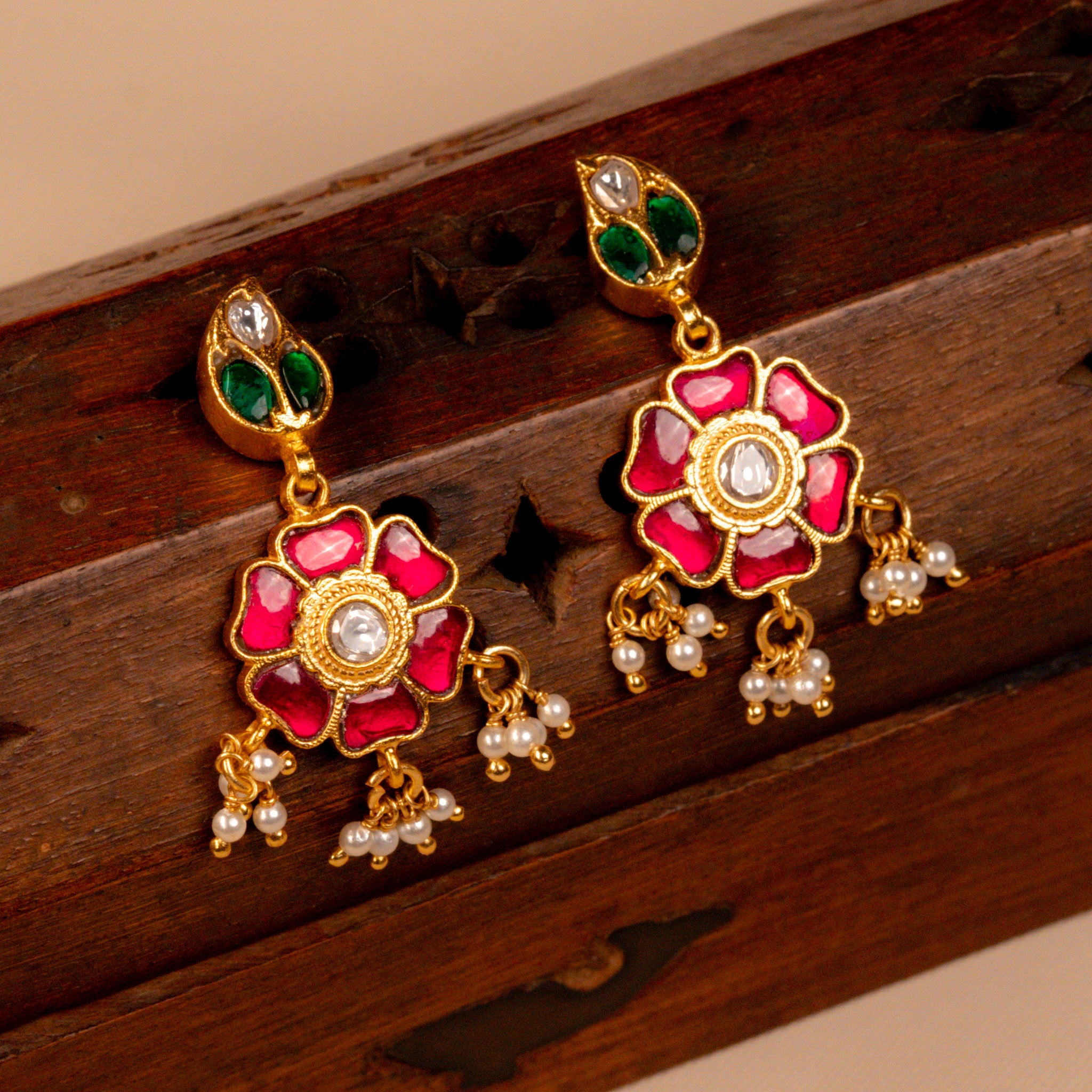 Pink Kundan Flower Droplets With Pearls Earrings in 24kt Gold Polish