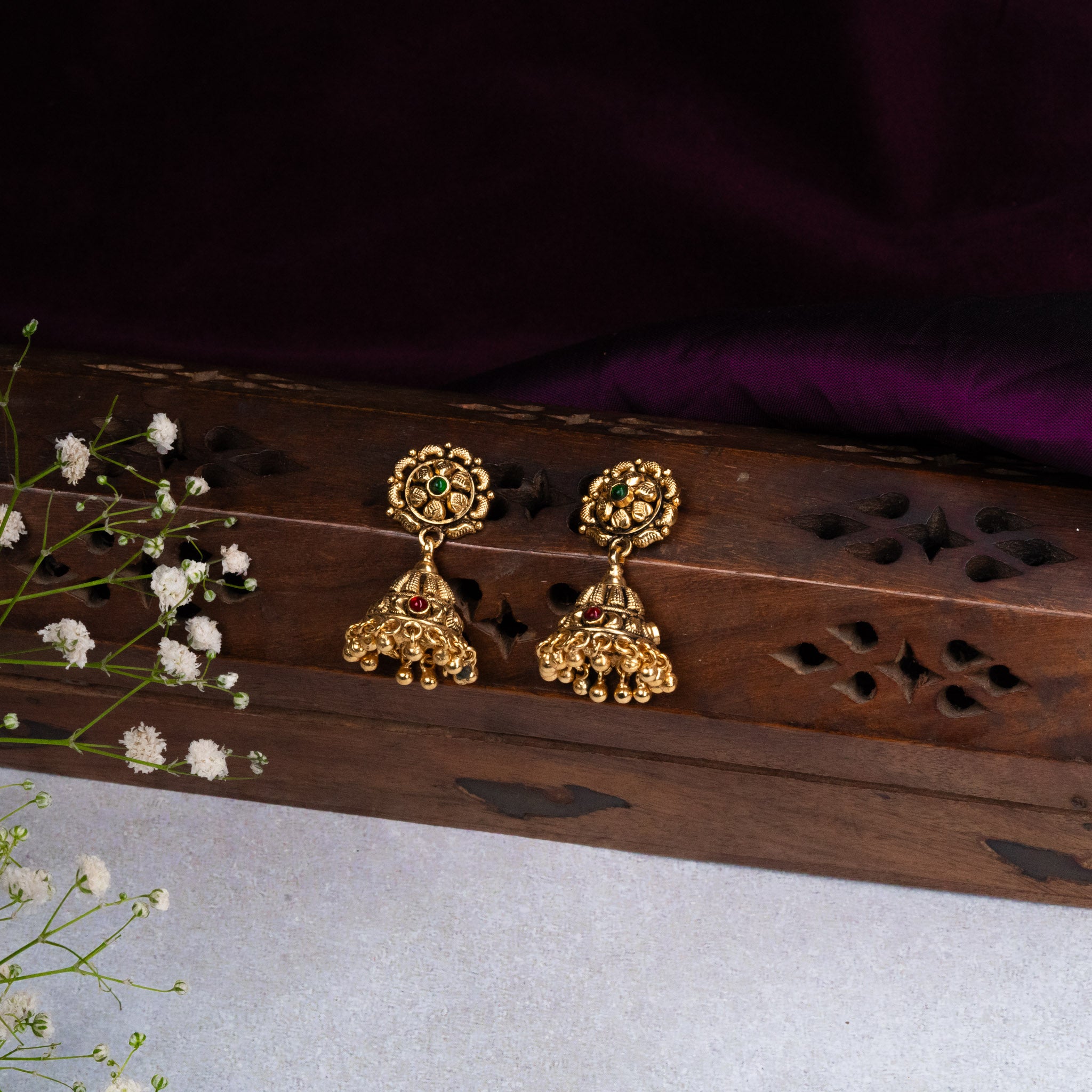 Deep Nakas Flower Shaped With Green Stones Gold Plated Jhumkas
