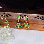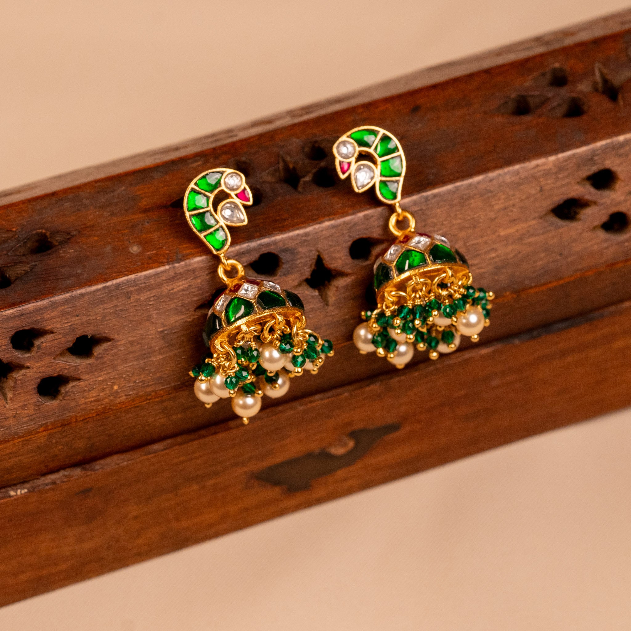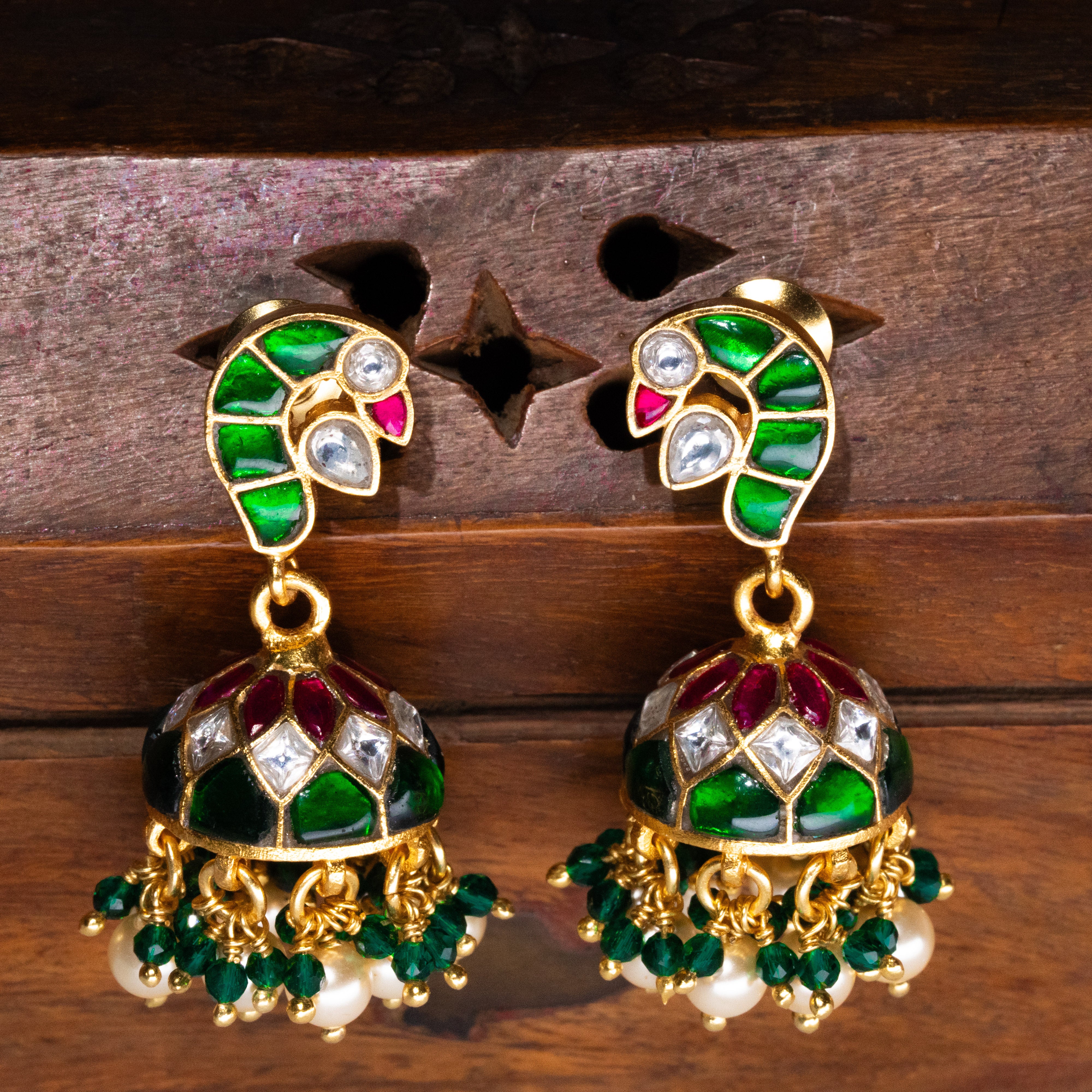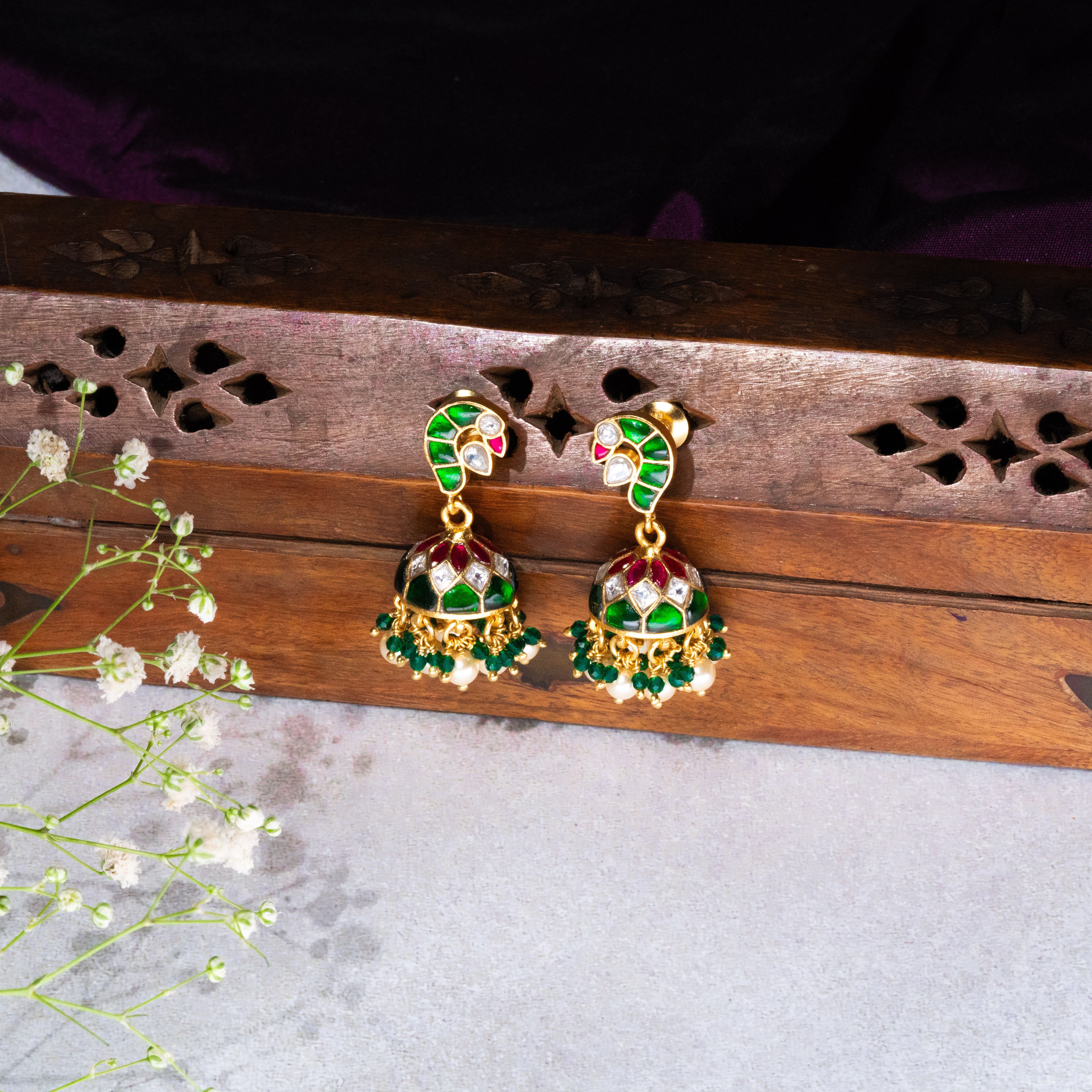 Peacock Green and Pink Kundan with Moissanite Jhumkas in 24kt Gold Polish