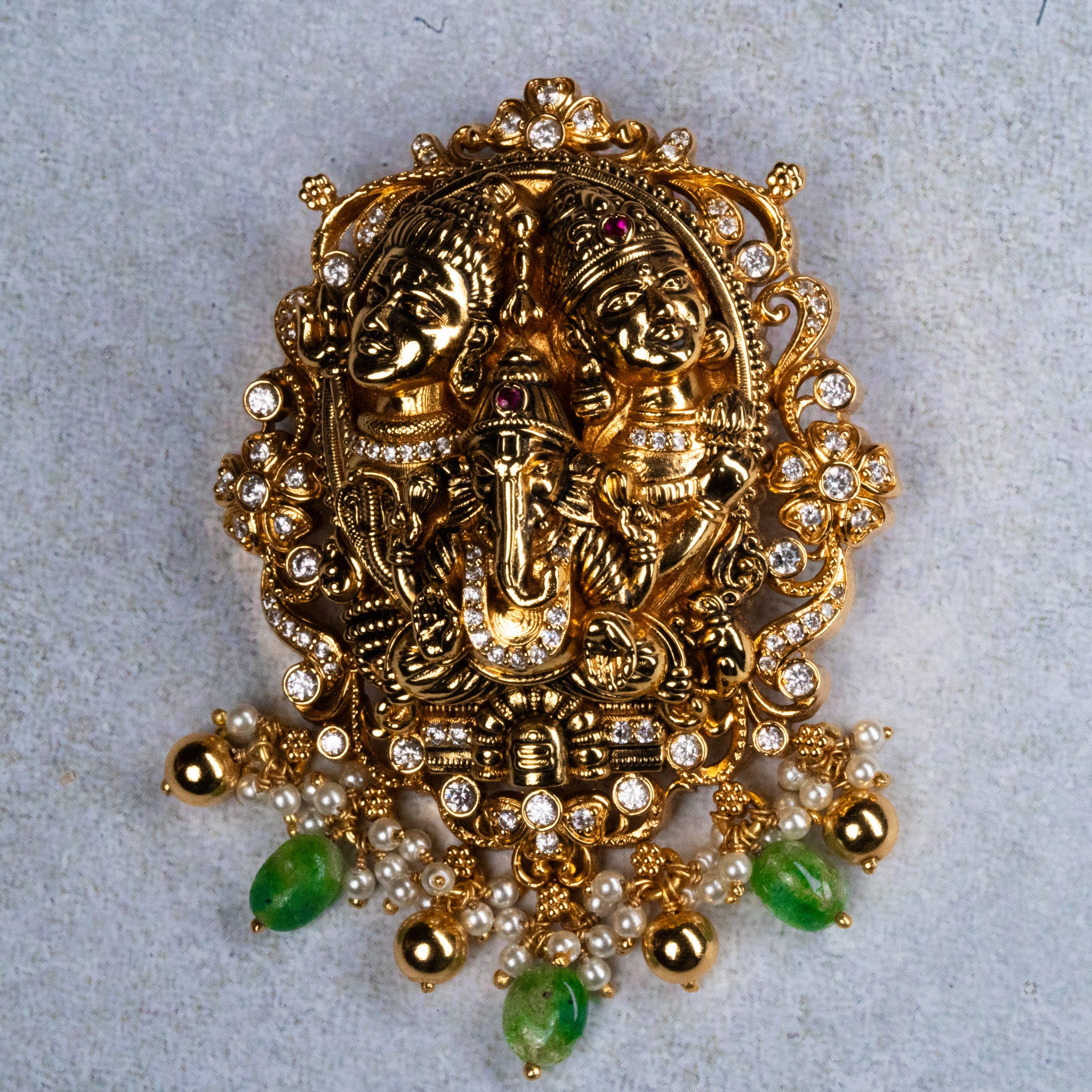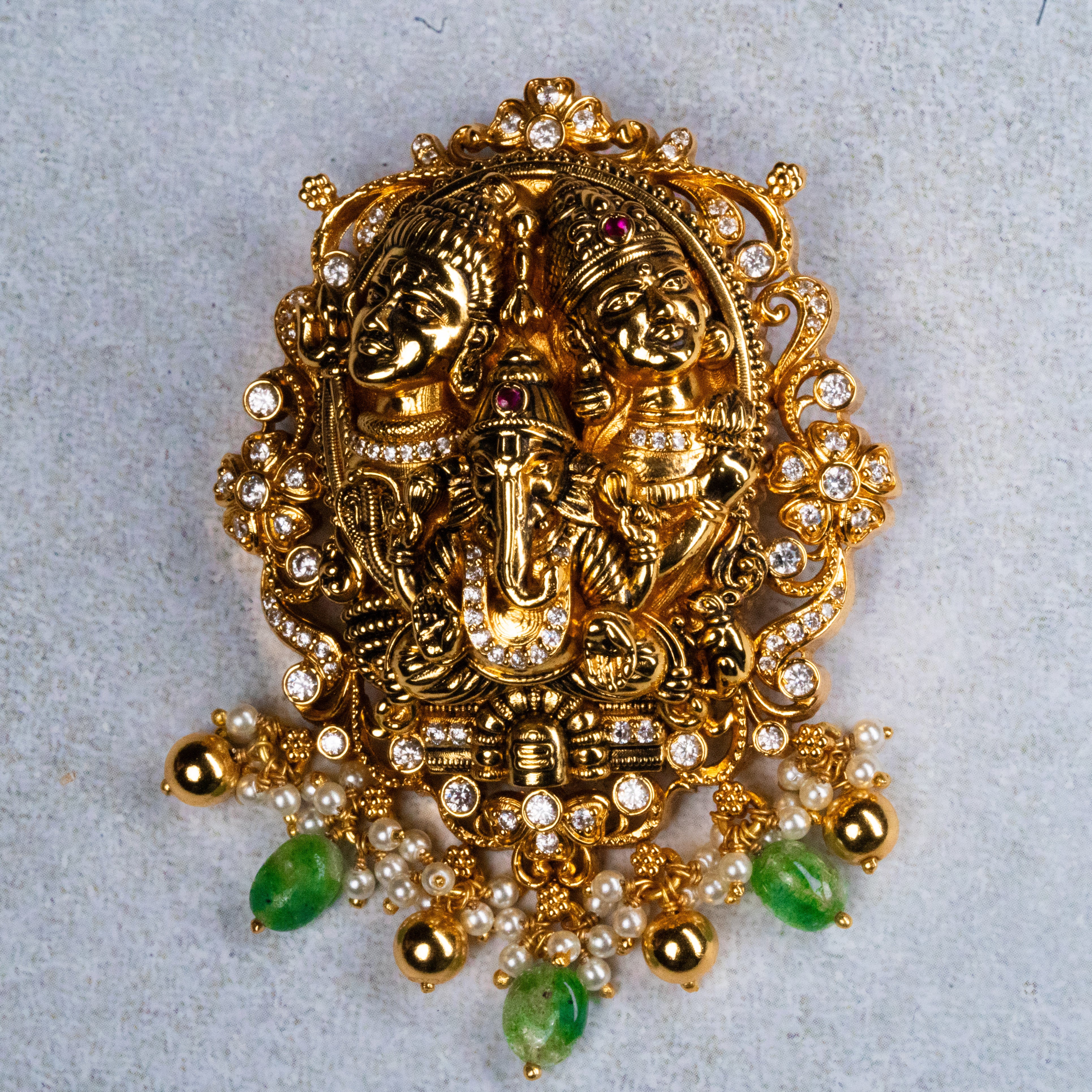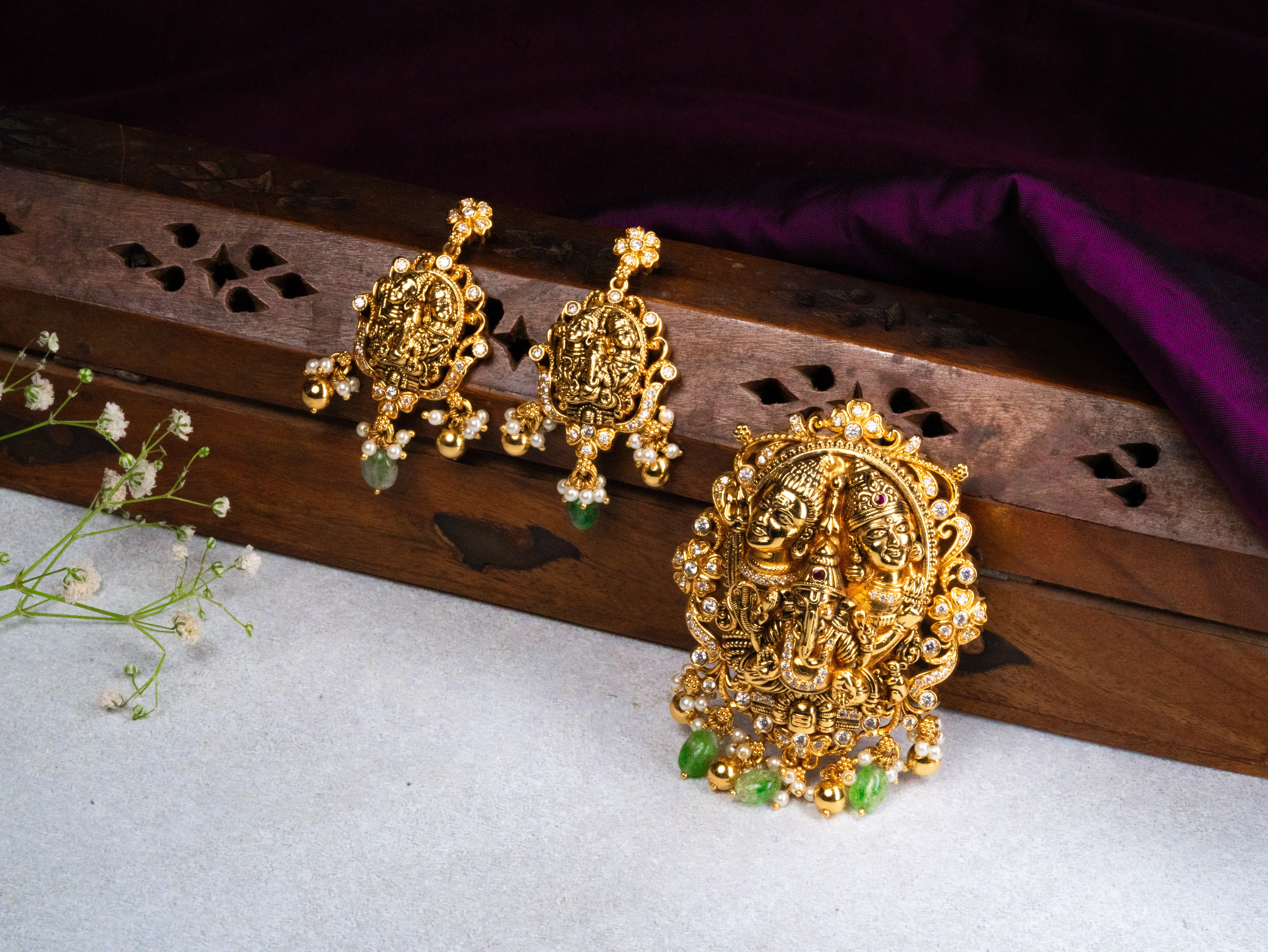 Deep Nakas Shiva Parvathi And Ganesha With Cz in Pendant With Earrings 24kt Gold Polish