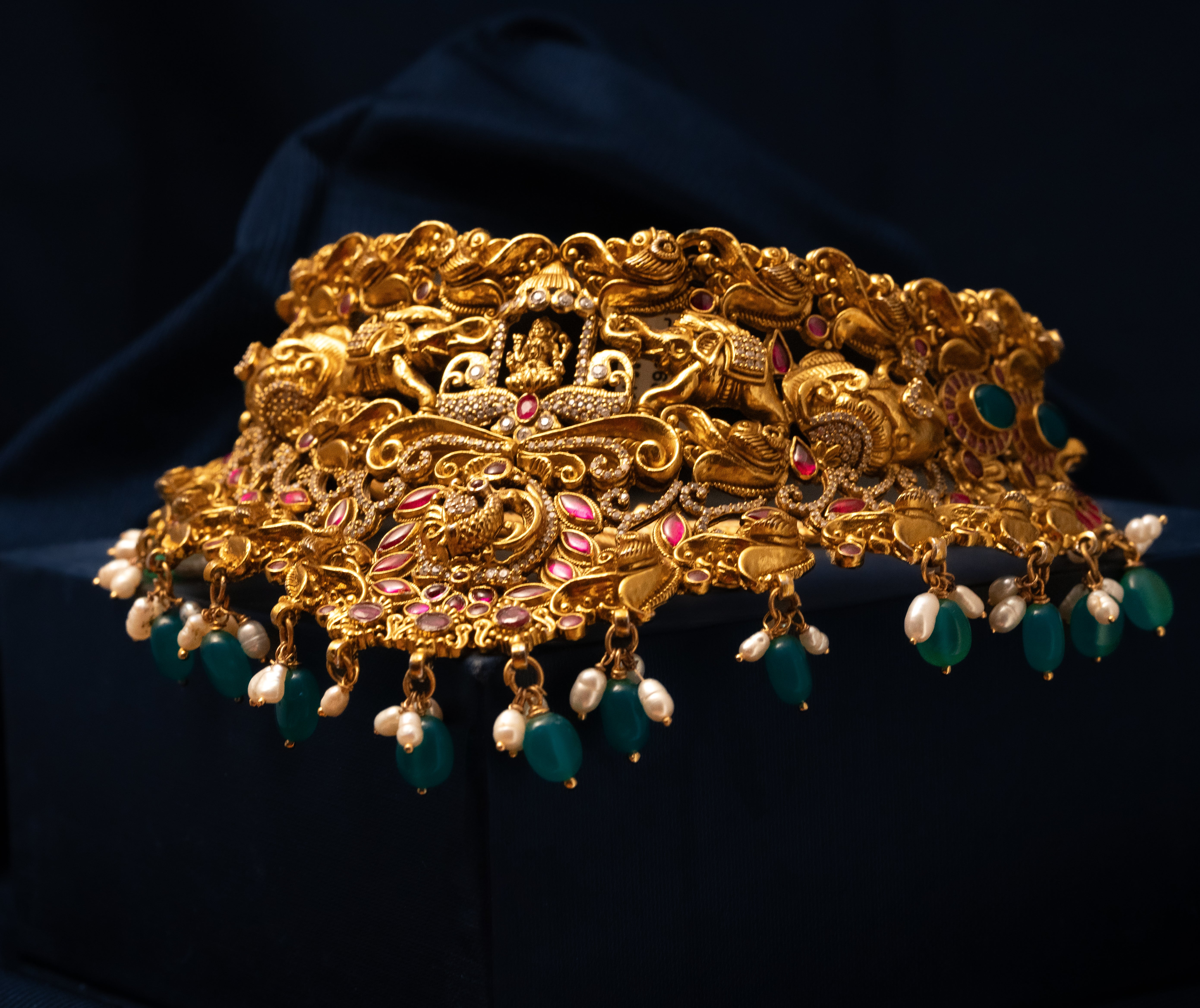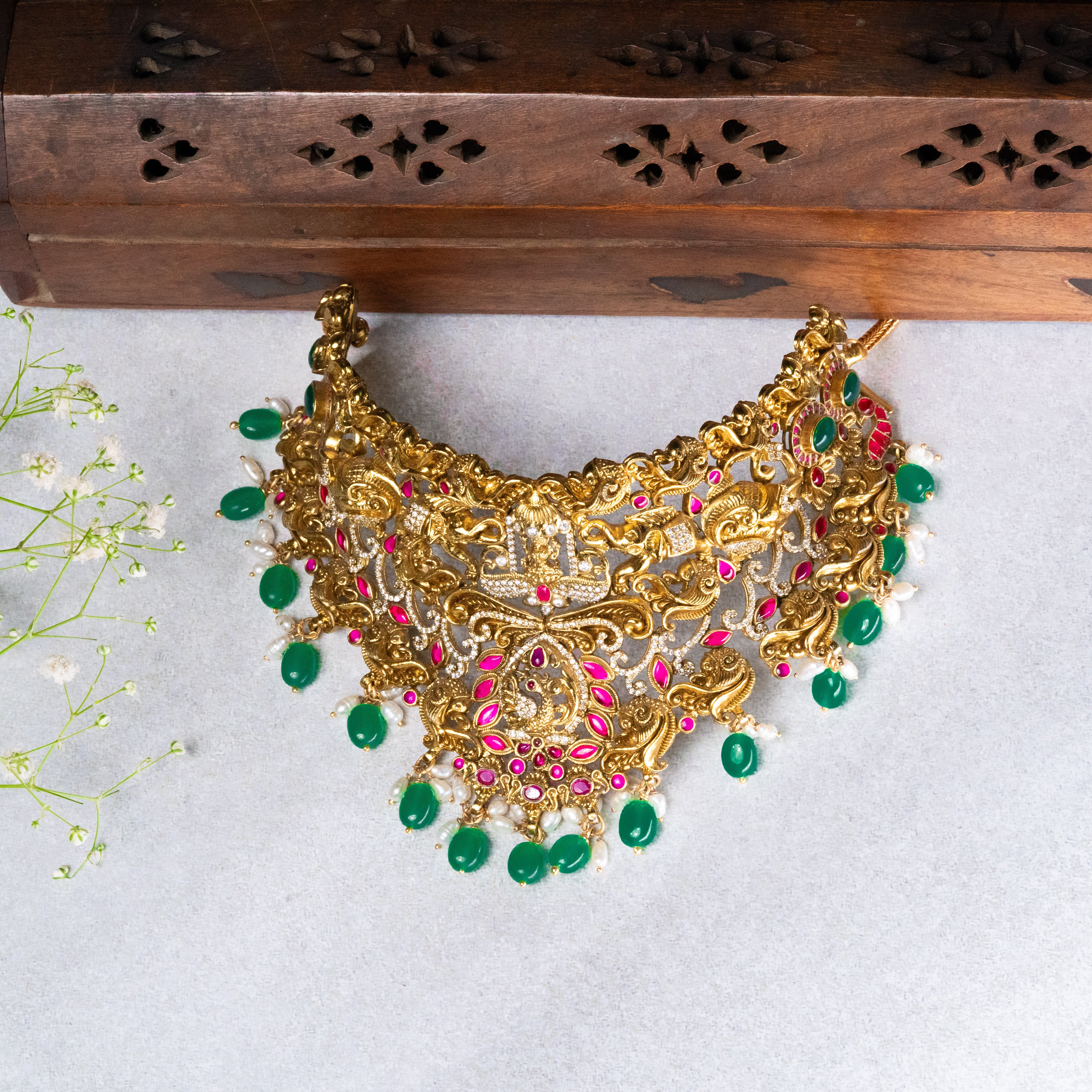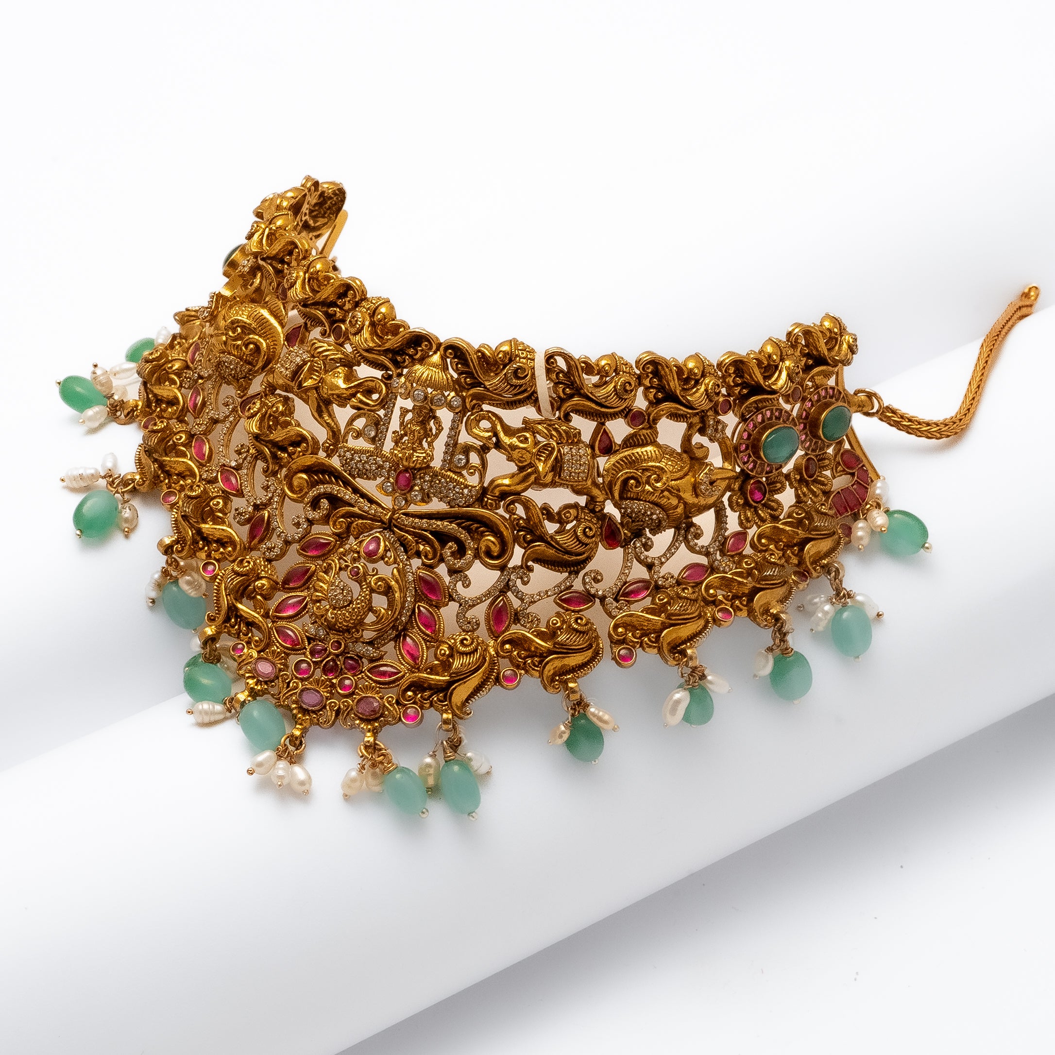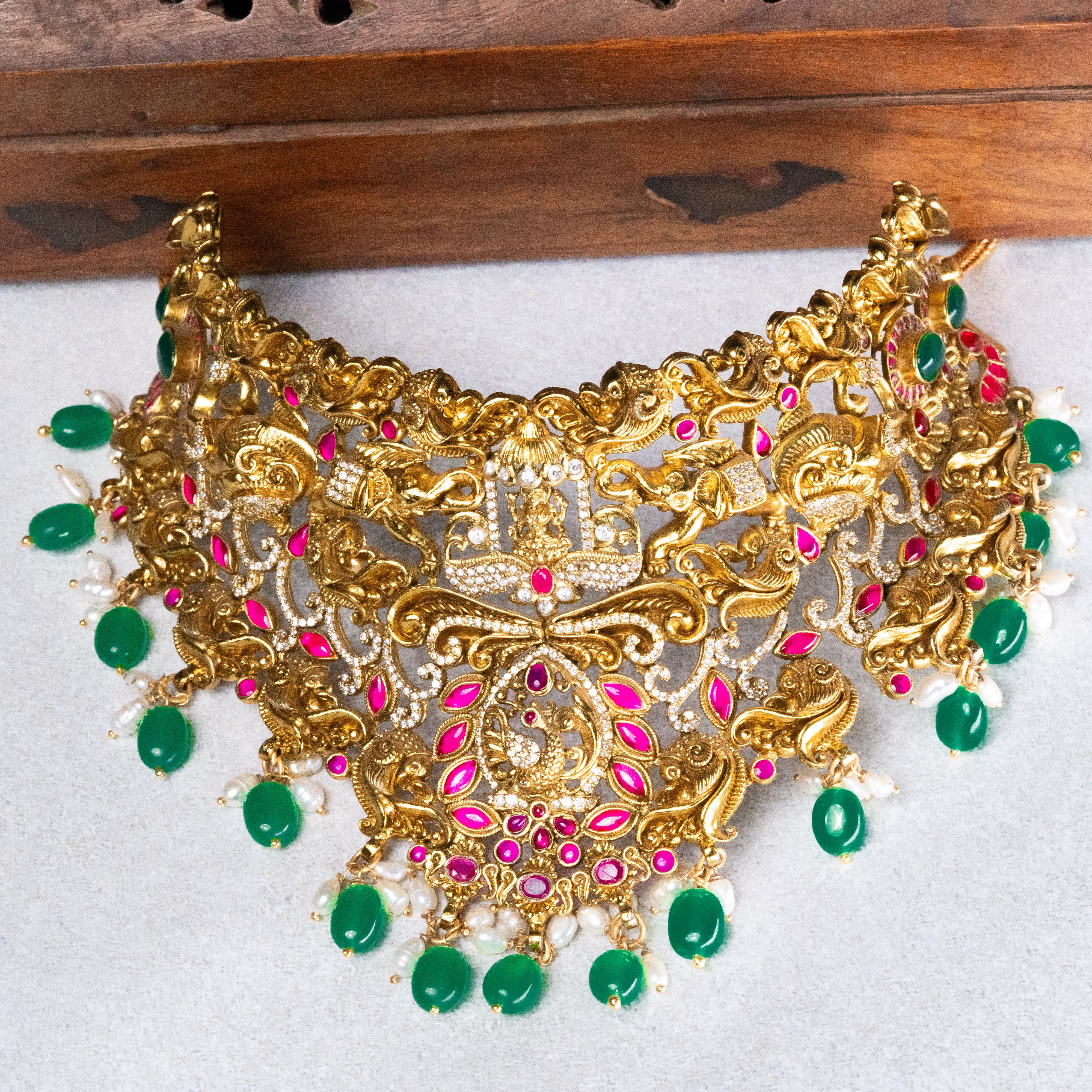 Deep Nakas Gajalaksmi With Pink Kundan And Green Polkis Choker in CZ studded 24kt Gold Polish