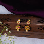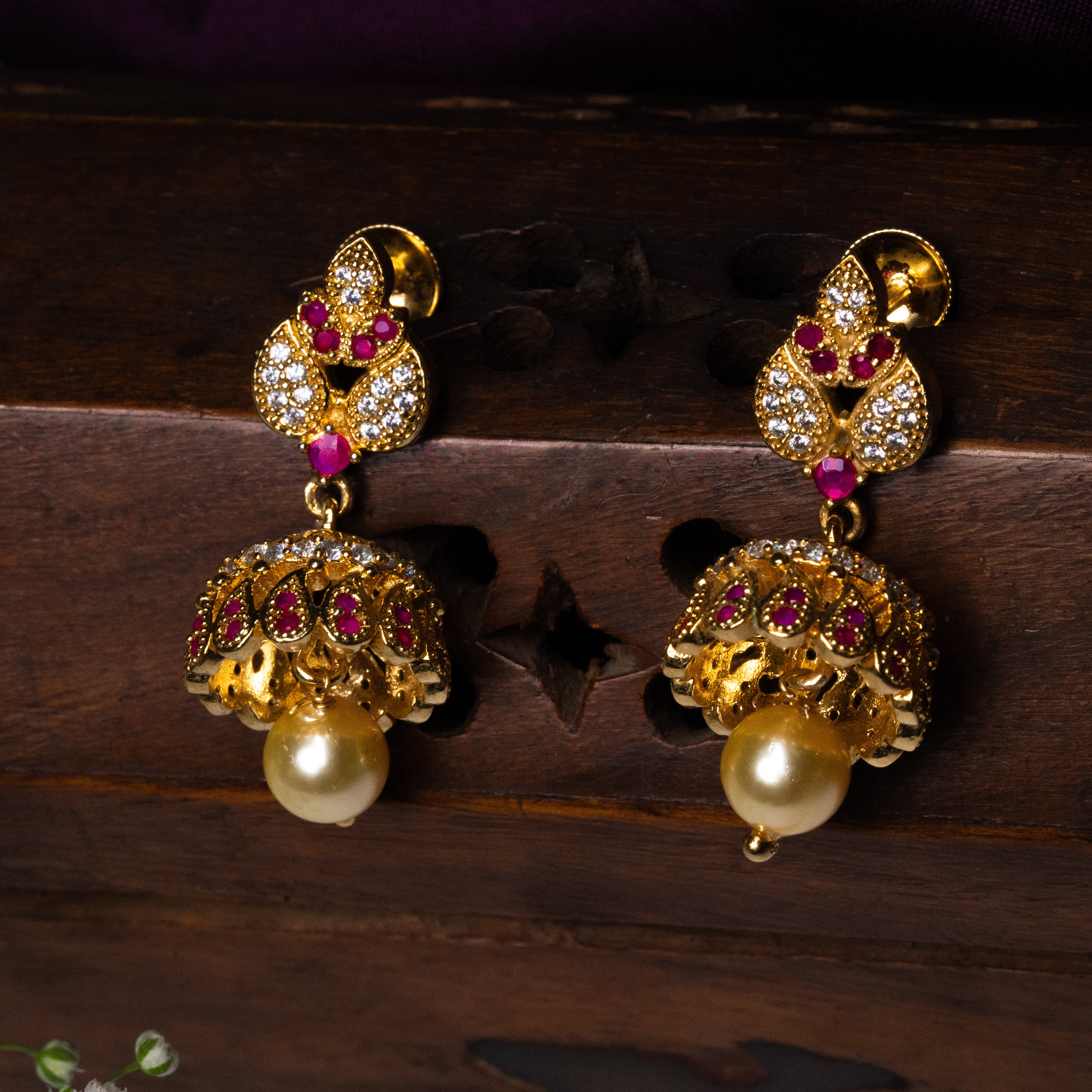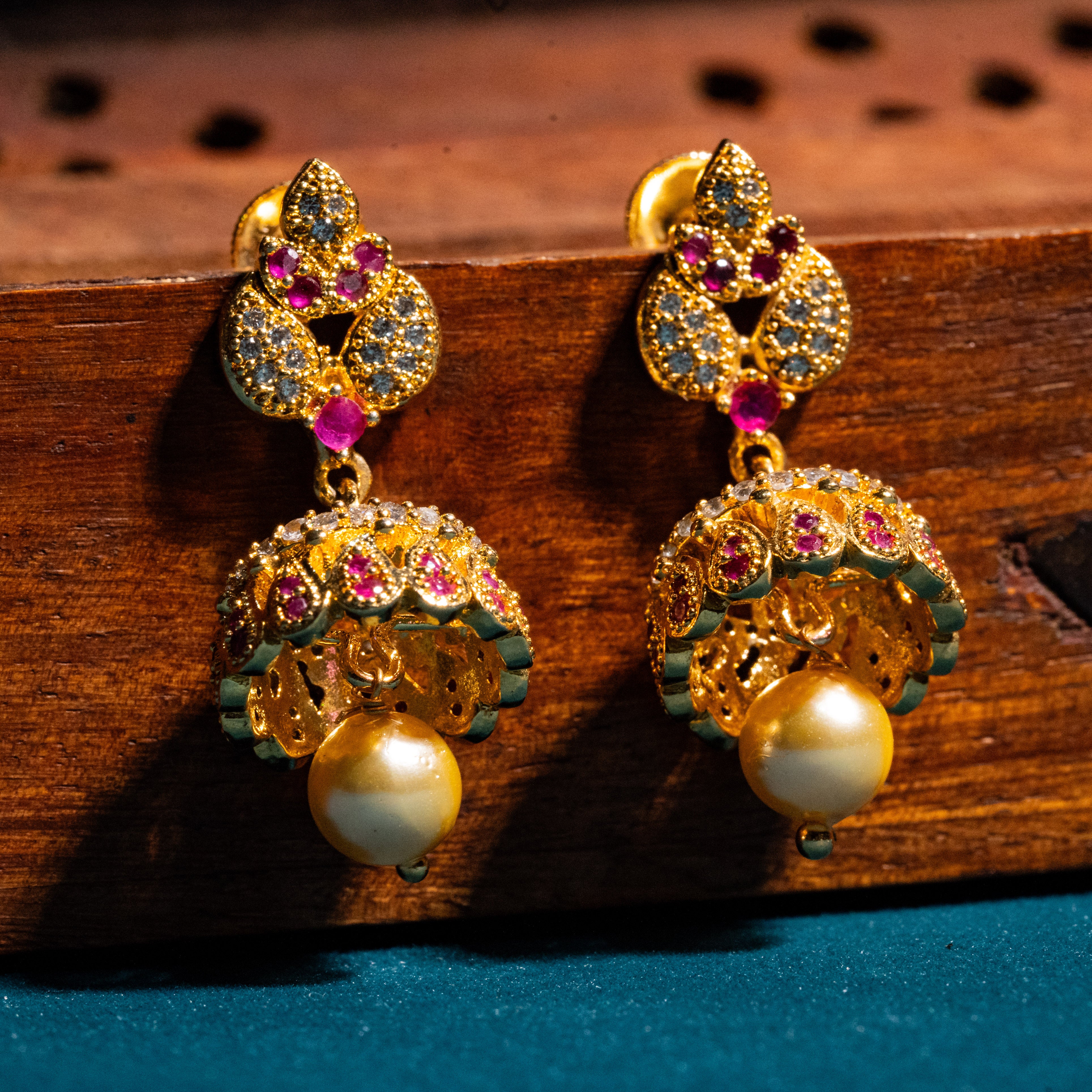 Leaves Studded In CZ And Pink Stone Earrings 18kt Gold Polish